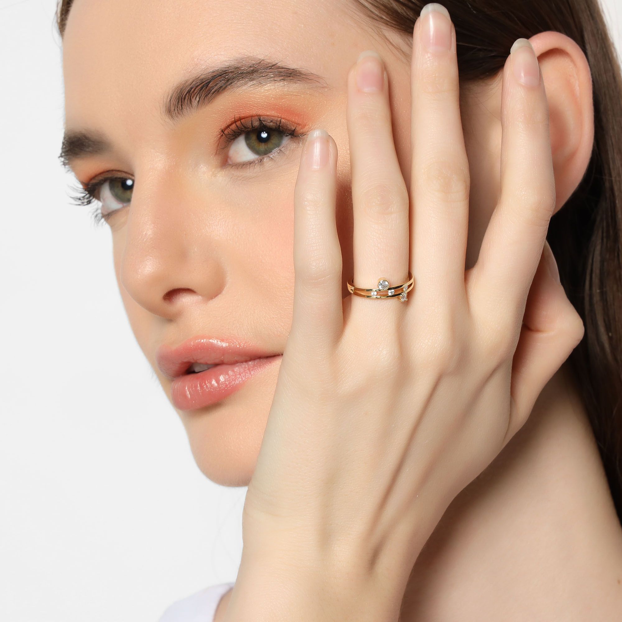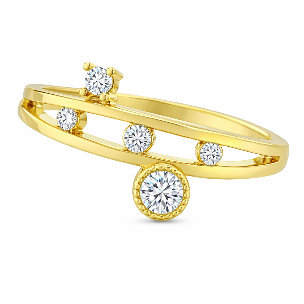 Exquisito anillo en baño de oro amarillo de 18 quilates , diseño ranurado, con cristal blanco corte brillante e incrustaciones de cristales blancos.