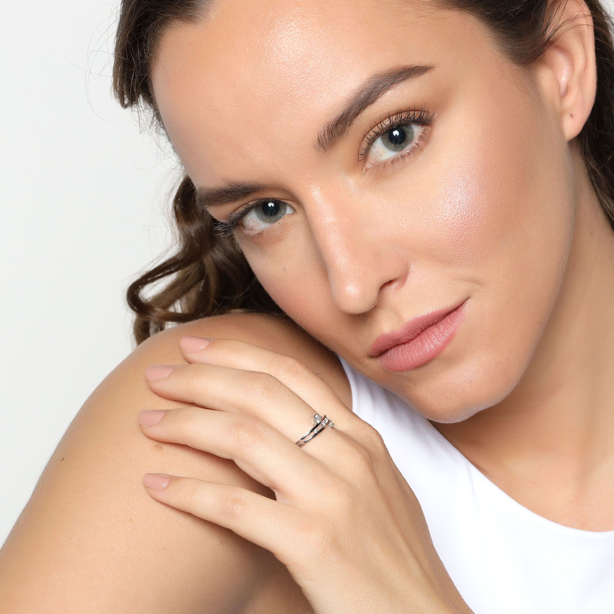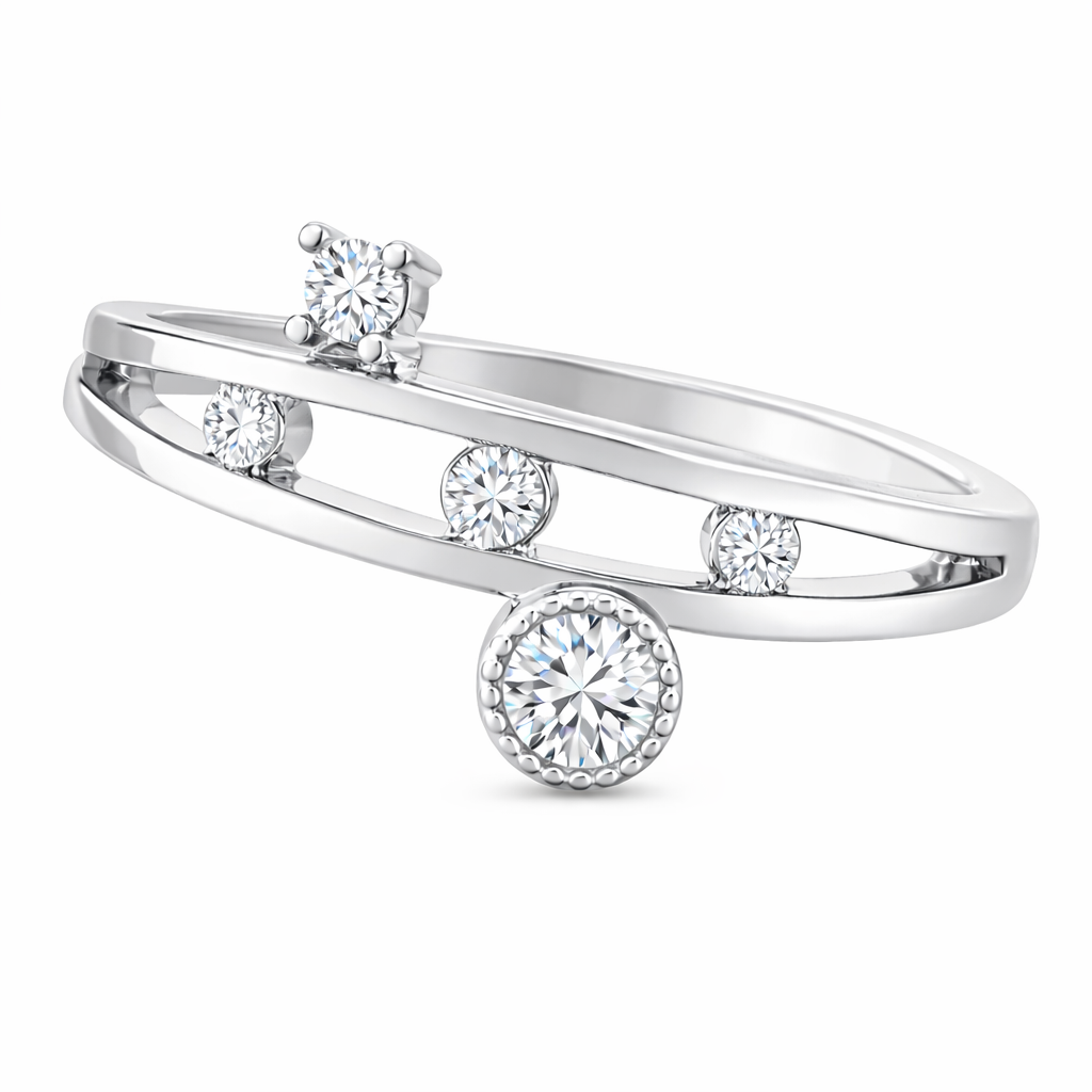 Exquisito anillo en baño de oro blanco de 18 quilates , diseño ranurado, con cristal blanco corte brillante e incrustaciones de cristales blancos.