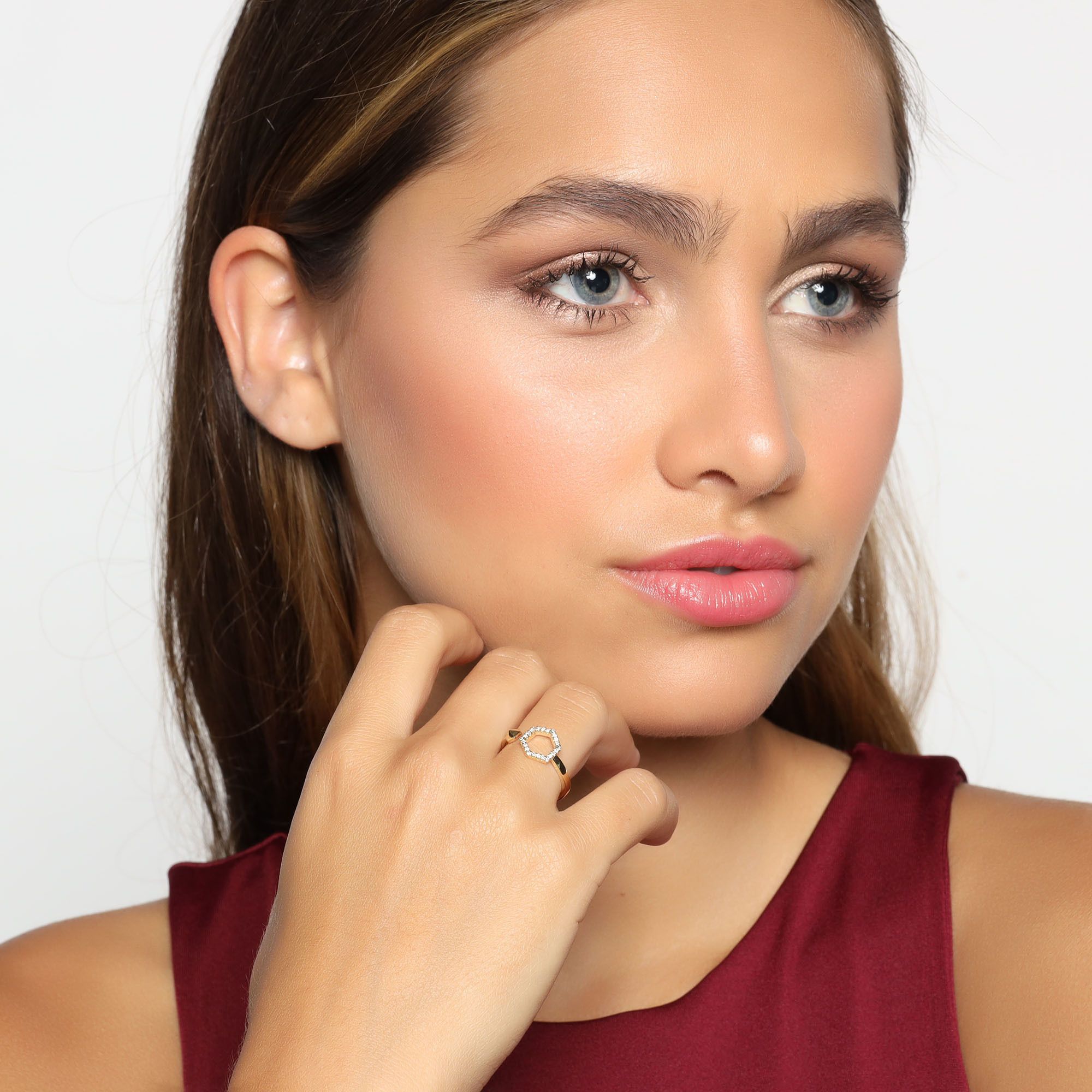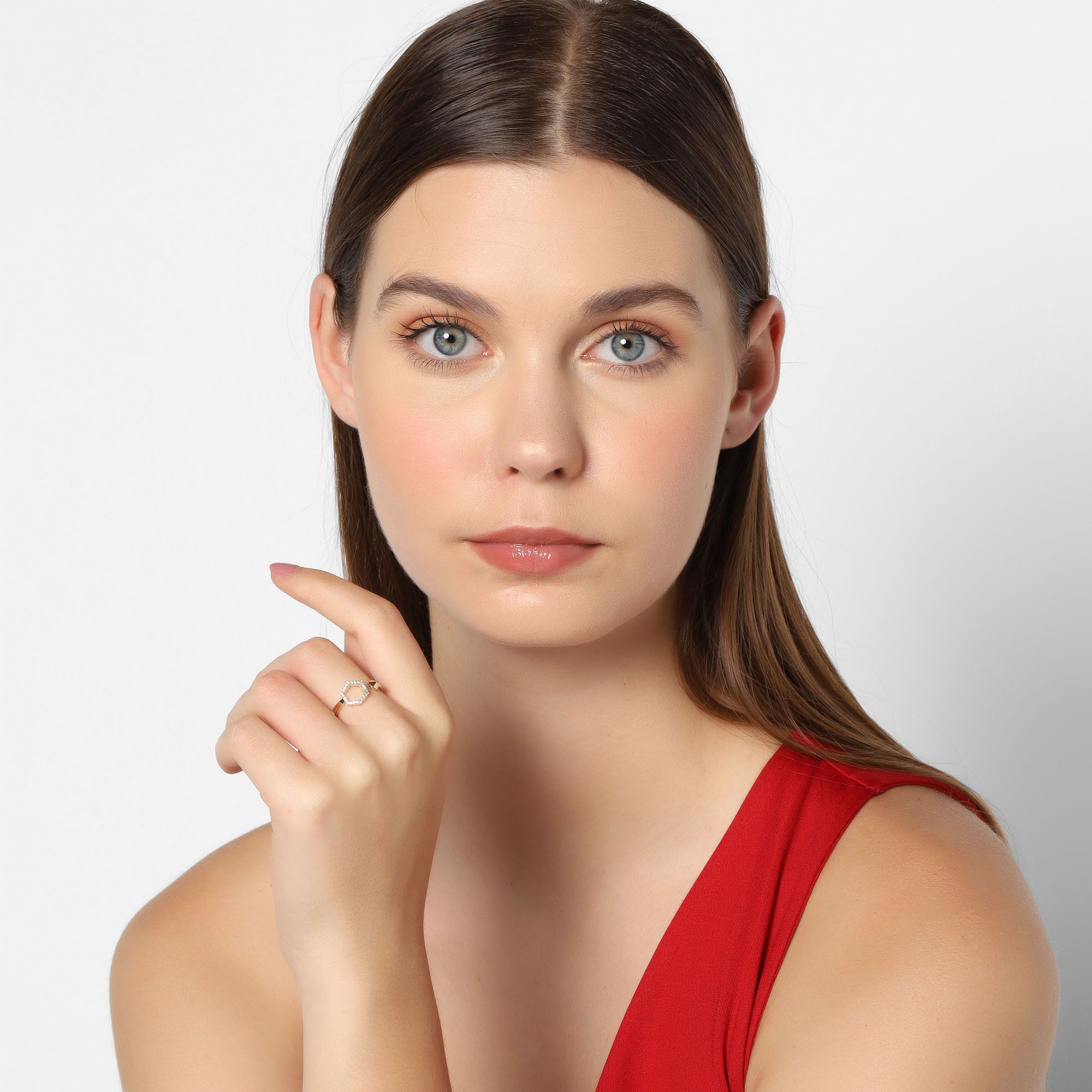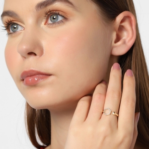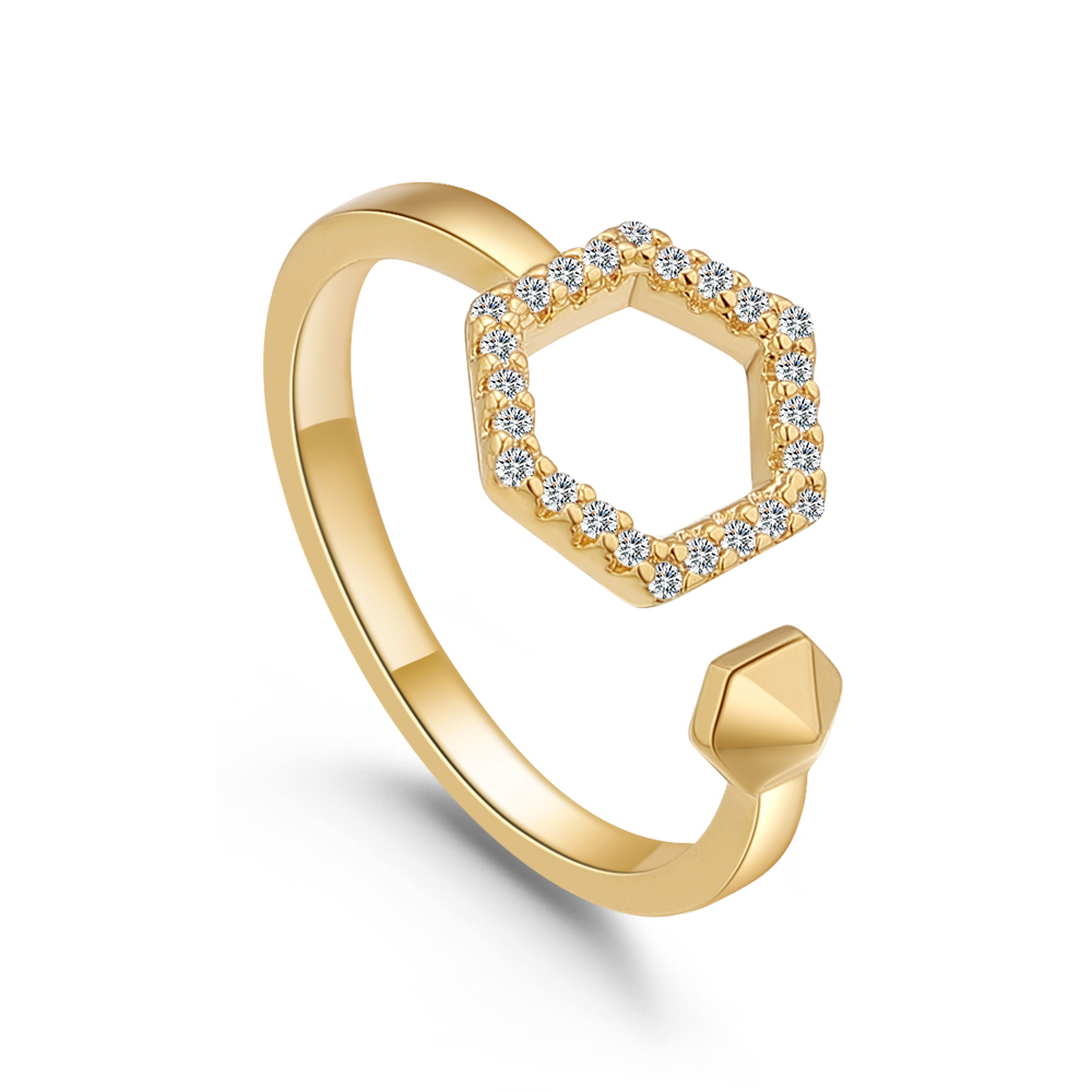 Bello anillo en baño de oro amarillo de 18 quilates , diseño de exágonos, con incrustaciones de cristales blancos.