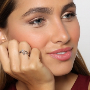 Bonito anillo en baño de oro blanco de 18 quilates , diseño de cruces, con incrustaciones de cristales blancos.