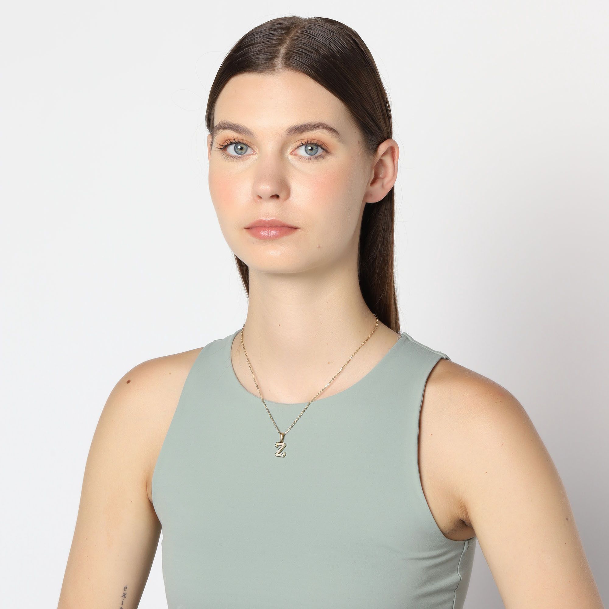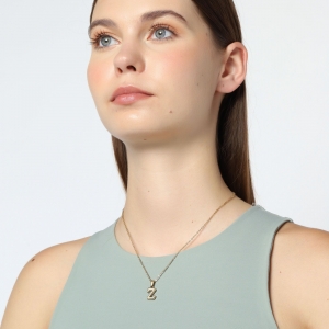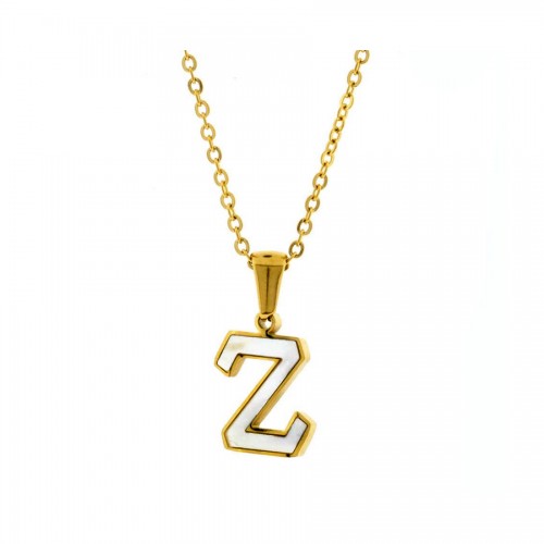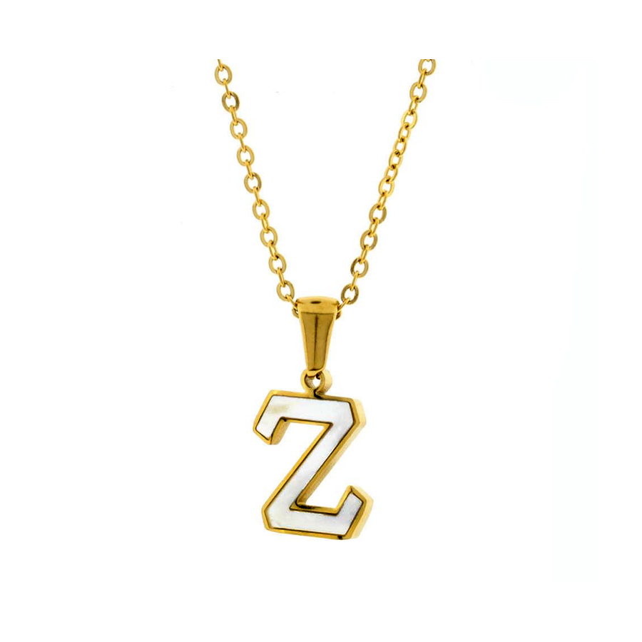 Dije con cadena en acero de titanio color amarillo, diseño de letra "Z", con placa de madre perla.
