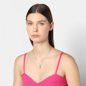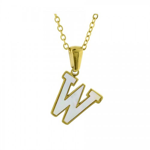 Dije con cadena en acero de titanio color amarillo, diseño de letra "W", con placa de madre perla.