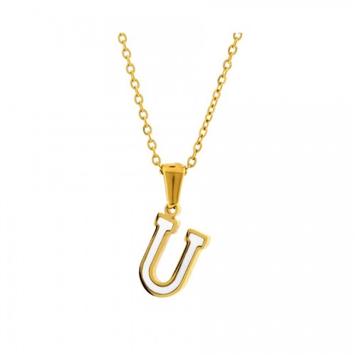 Dije con cadena en acero de titanio color amarillo, diseño de letra "U", con placa de madre perla.