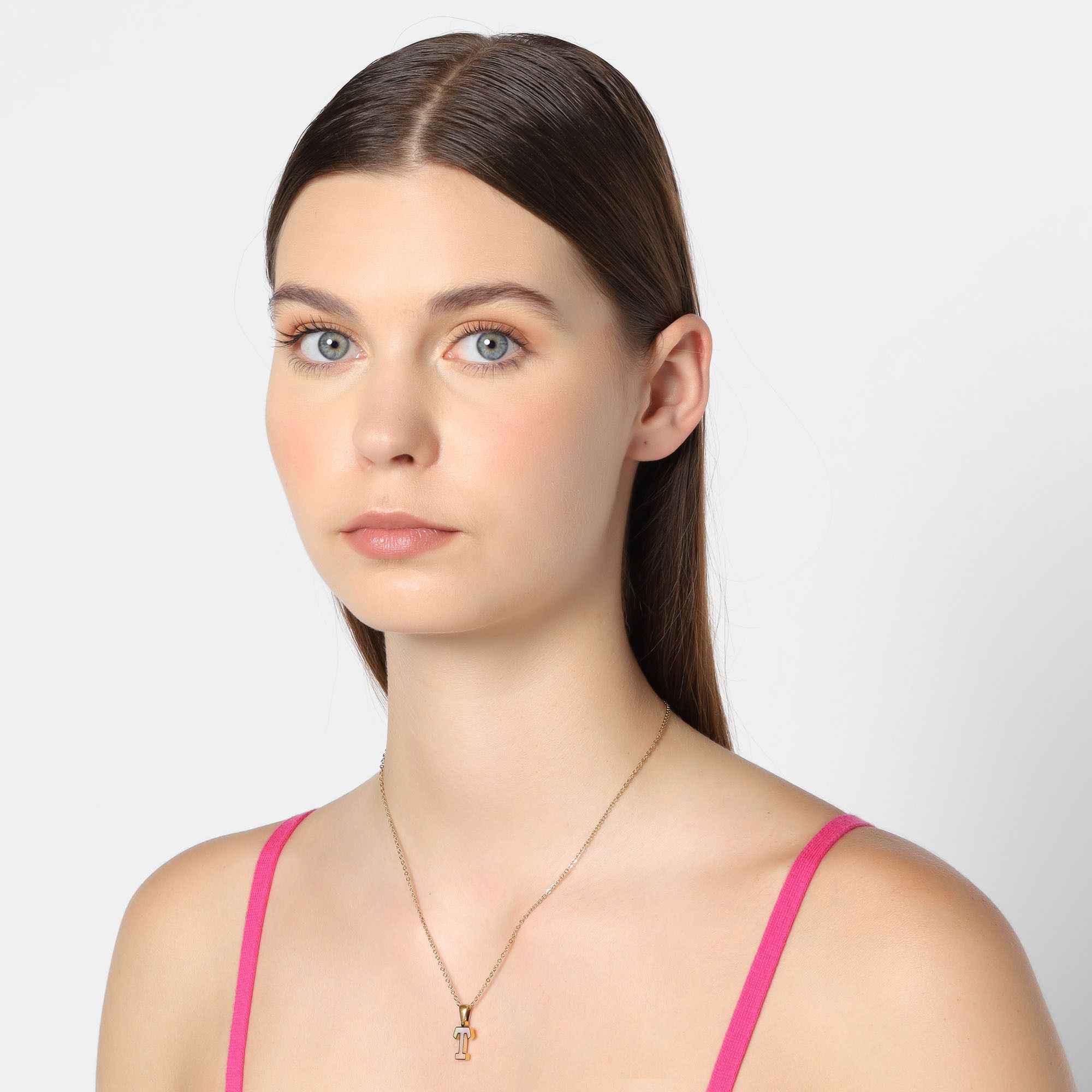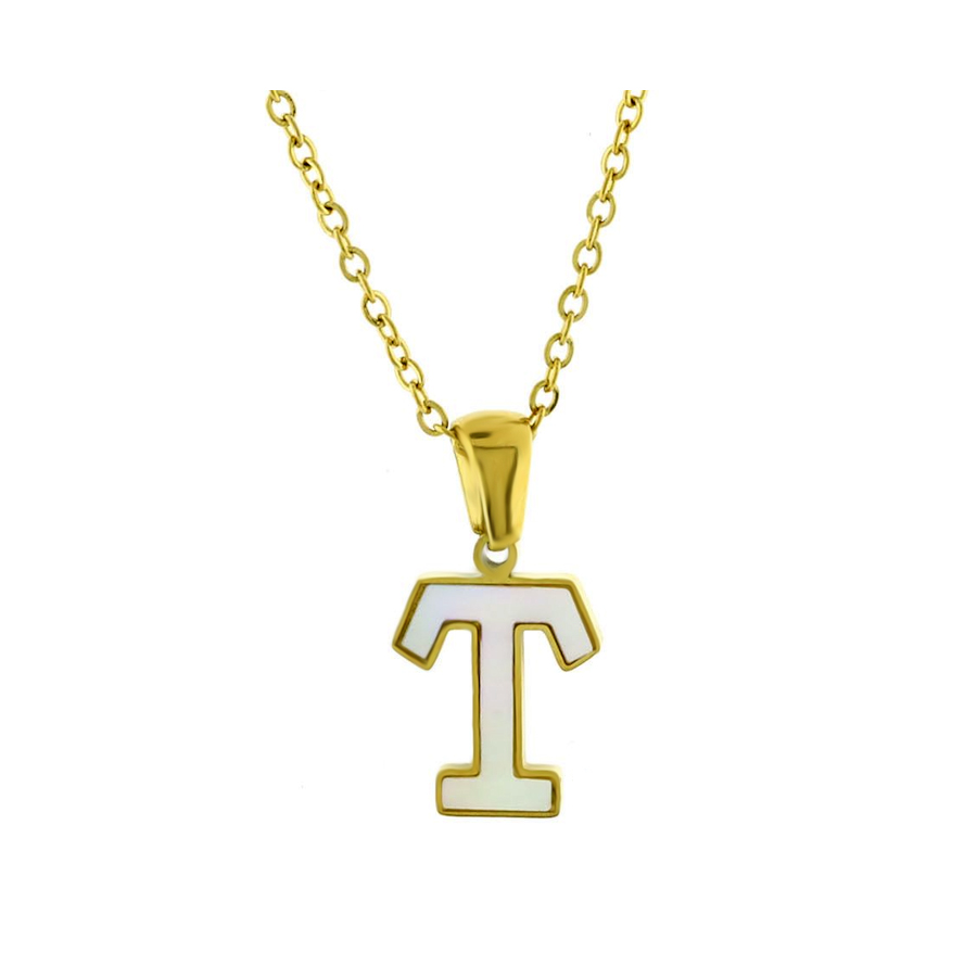 Dije con cadena en acero de titanio color amarillo, diseño de letra "T", con placa de madre perla.