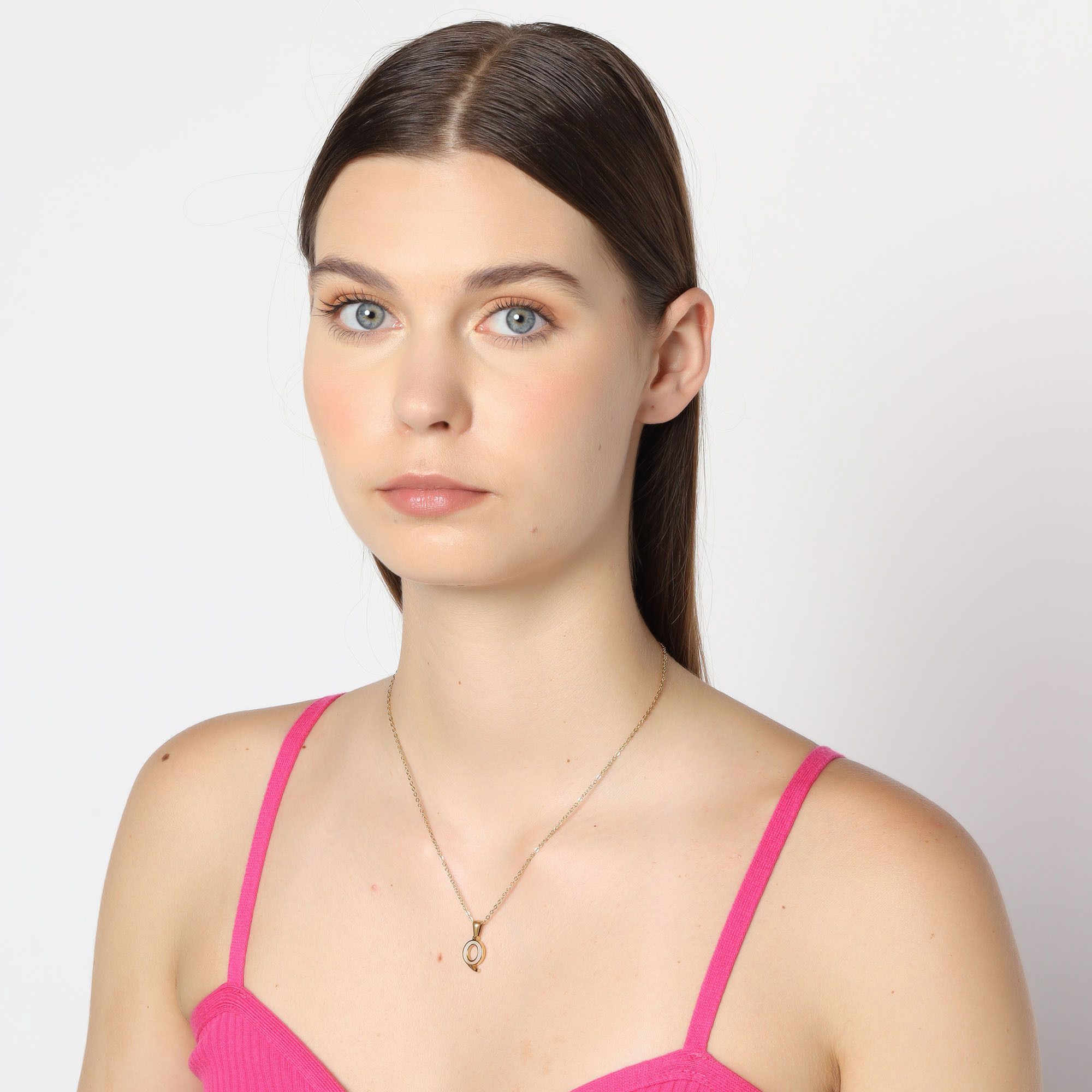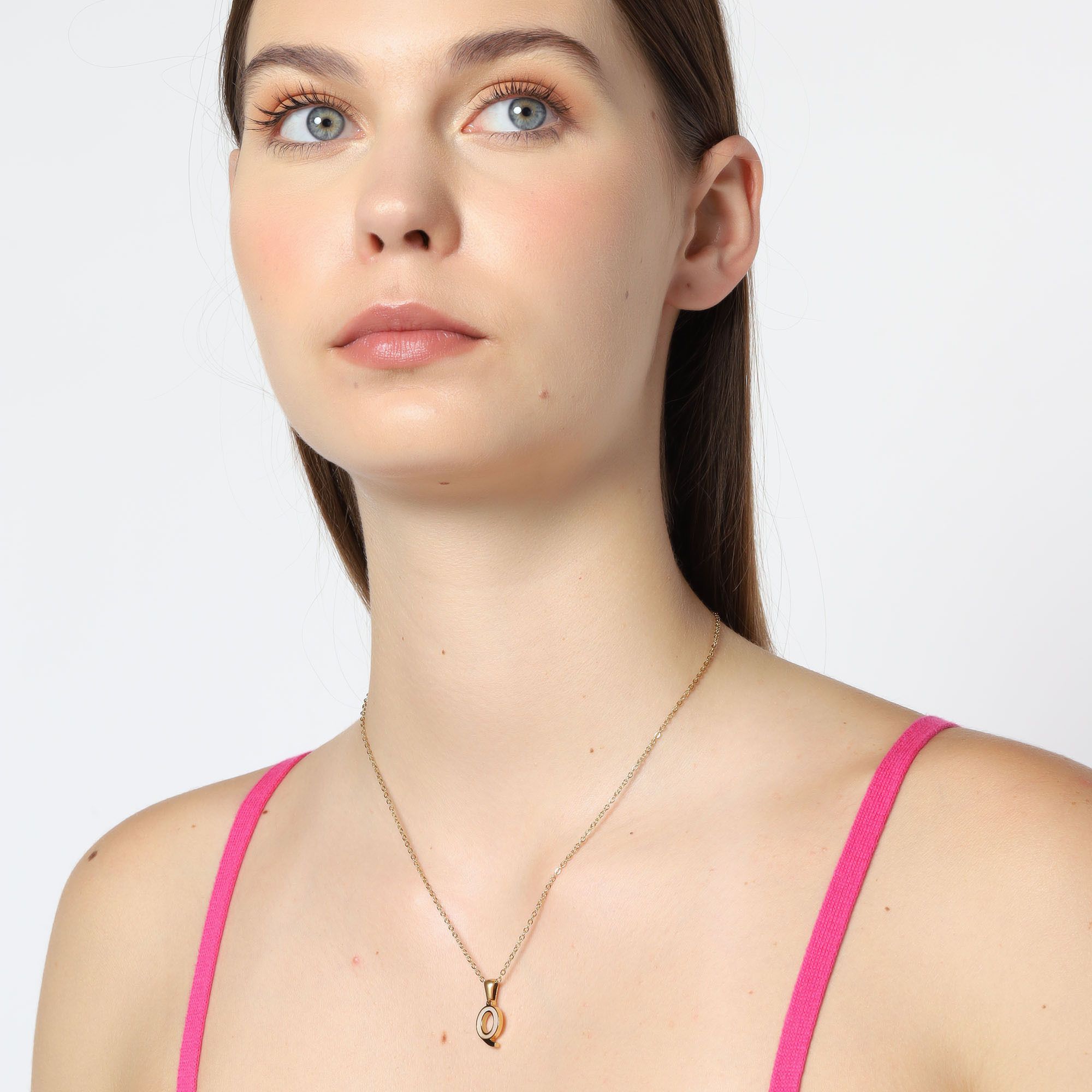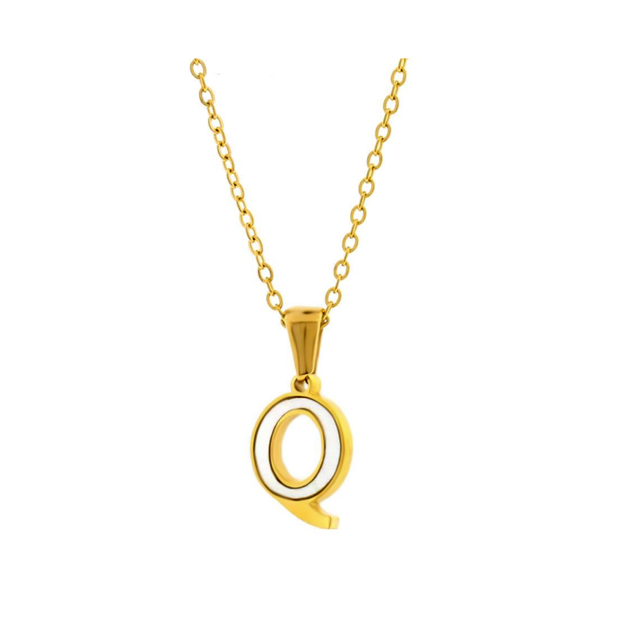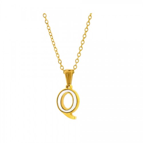 Dije con cadena en acero de titanio color amarillo, diseño de letra "Q", con placa de madre perla.