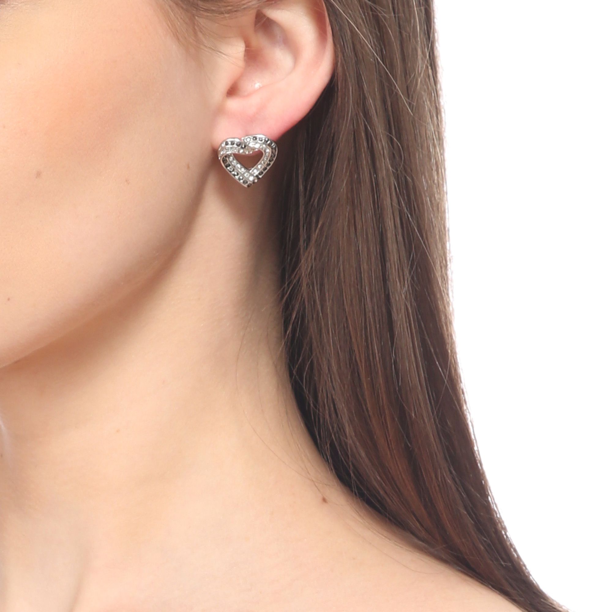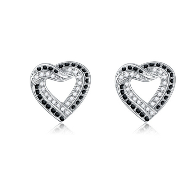 Aretes en baño de oro blanco de 18 quilates, diseño de corazón, estilo trenzado, con incrustación de cristales en color blanco y negro.