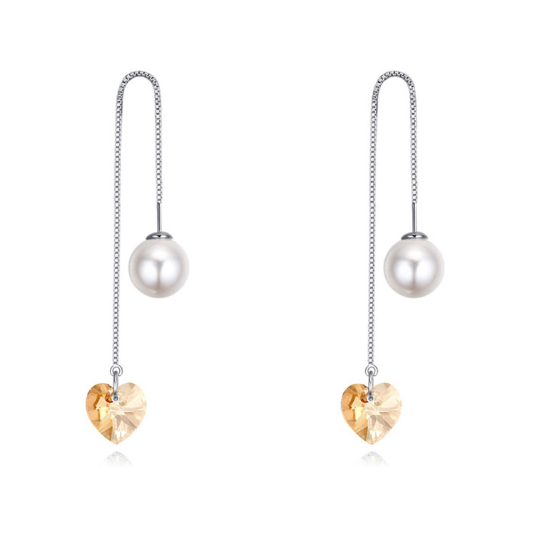Bellos pendientes, en baño de oro blanco de 18 quilates, fino diseño, con corazón de cristal en color ámbar y perla blanca.