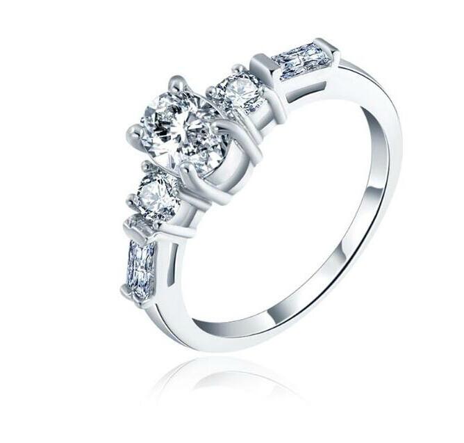 Anillo en baño de oro blanco de 18 quilates, fino diseño, con cristal blanco corte brillante e incrustaciones de cristales en color blanco.