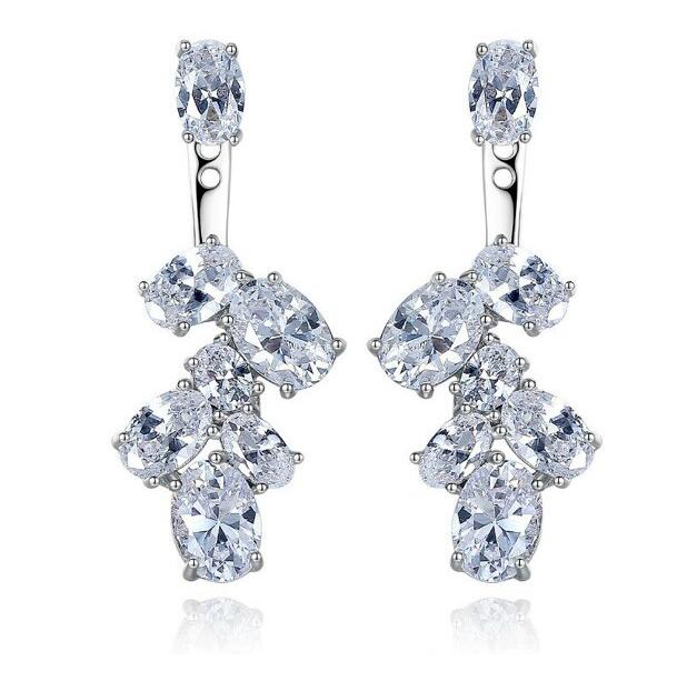 Aretes en baño de oro blanco de 18 quilates, fino diseño, estilo cascada, con incrustaciones de cristales blancos corte oval.