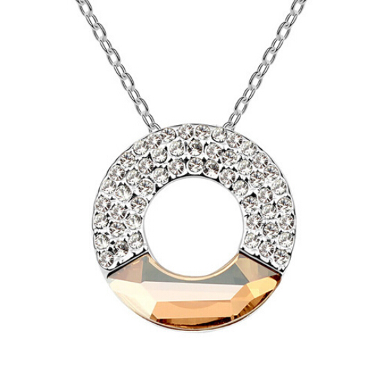 Dije con cadena en baño de oro blanco de 18 quilates, diseño circular con cristal ámbar e incrustaciones de cristales blancos.