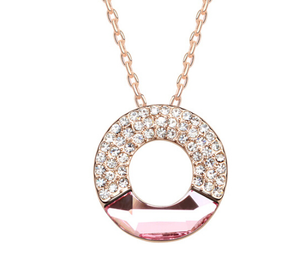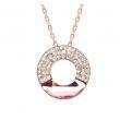Dije con cadena en baño de oro amarillo de 18 quilates, diseño circular con cristal rosa e incrustaciones de cristales blancos.