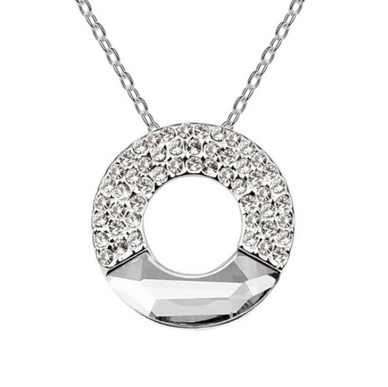 Dije con cadena en baño de oro blanco de 18 quilates, diseño circular con cristal blanco e incrustaciones de cristales blancos.