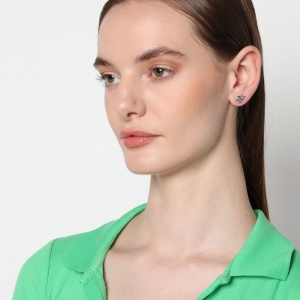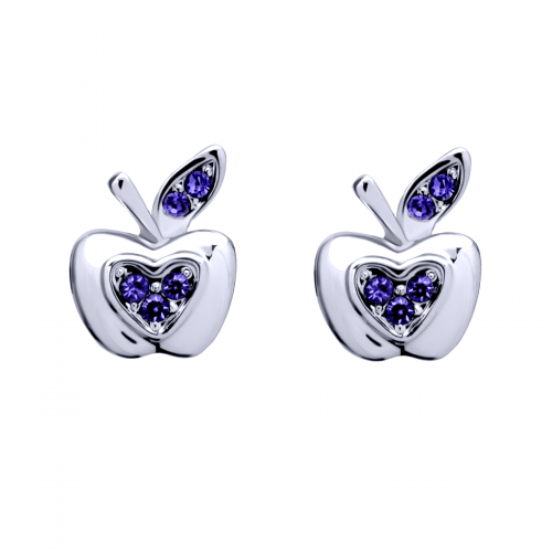 Aretes en baño de oro blanco de 18 quilates, simpático diseño de manzana, con pequeño corazón al centro e incrustraciones de cristales en color morado.