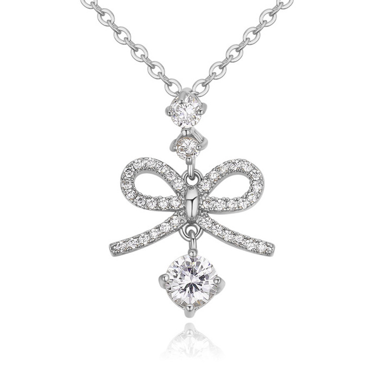 Dije con cadena en baño de oro blanco de 18 quilates, diseño de moño con incrustación de cristales en color blanco. Fabricado en una estructura de aleación de platino con rodio sin níquel 1. joyería Hipoalergénica. 2. Incluye cajita de joyería. 3. Garantía de 30 días por defectos de fabrica.