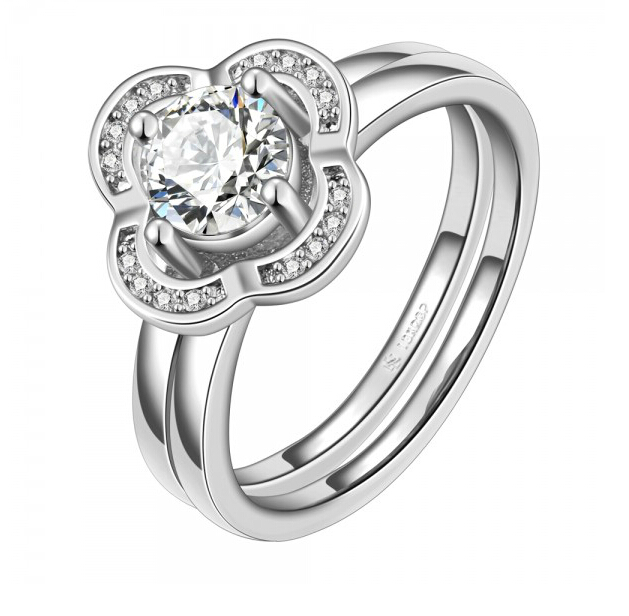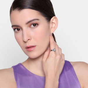Anillo en baño de oro blanco de 18 quilates, diseño de flor, con cristal blanco corte brillante e incrustaciones de cristales blancos.