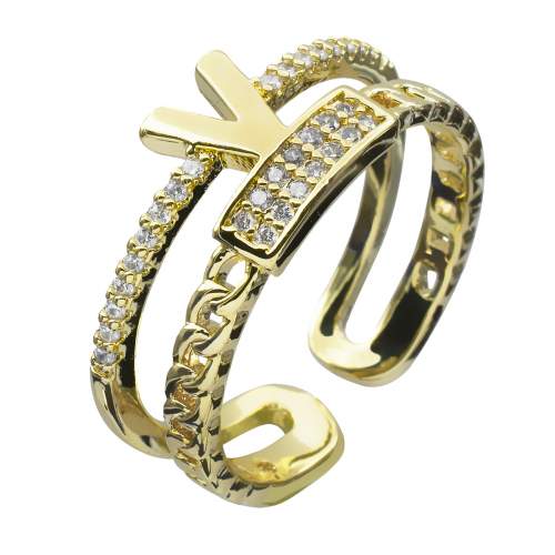 Exclusivo anillo en baño de oro amarillo de 18 quilates , diseño de "V", con incrustaciones de cristales blancos. Ajustable tallas 7-8.