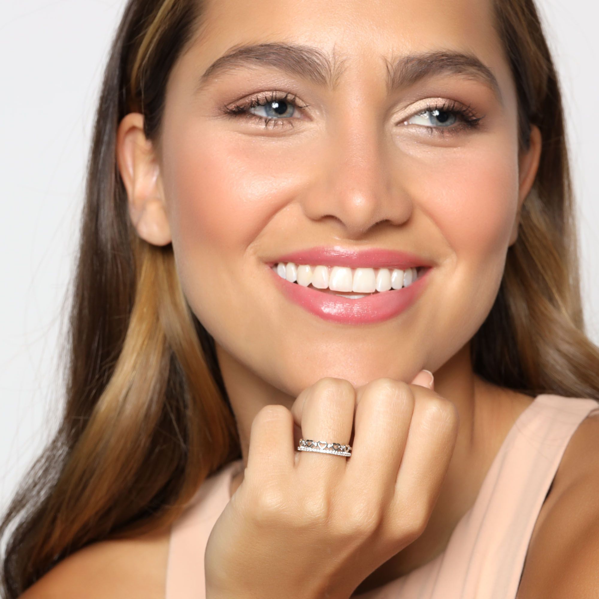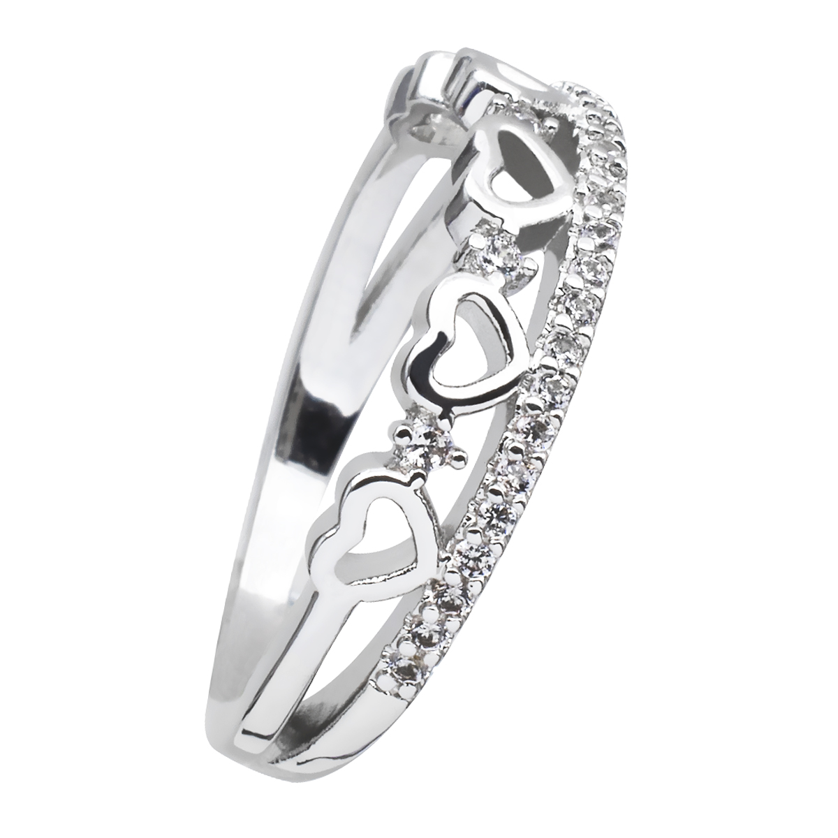 Tierno anillo en baño de oro blanco de 18 quilates , diseño de corazones calados, con incrustaciones de cristales blancos.