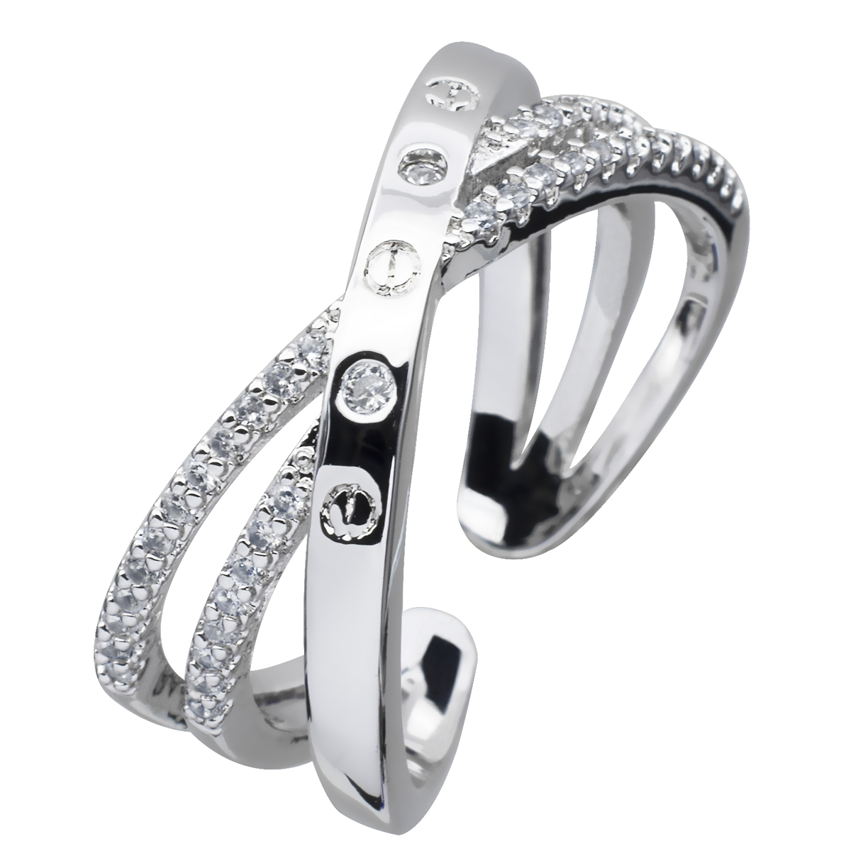 Exquisito anillo en baño de oro blanco de 18 quilates , diseño cruzado con incrustaciones de cristales blancos. Ajustable Tallas 7-8.