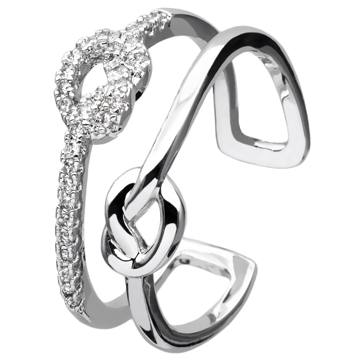 Lindo anillo en baño de oro blanco de 18 quilates , diseño de pretzels con incrustaciones de cristales blancos.