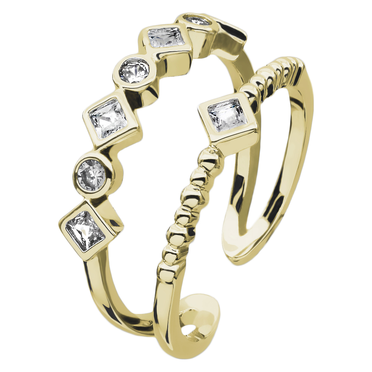 Lindo anillo en baño de oro amarillo de 18 quilates , diseño geométrico, estilo doble aro, con incrustaciones de cristales blancos. Ajustable Tallas 6-7.