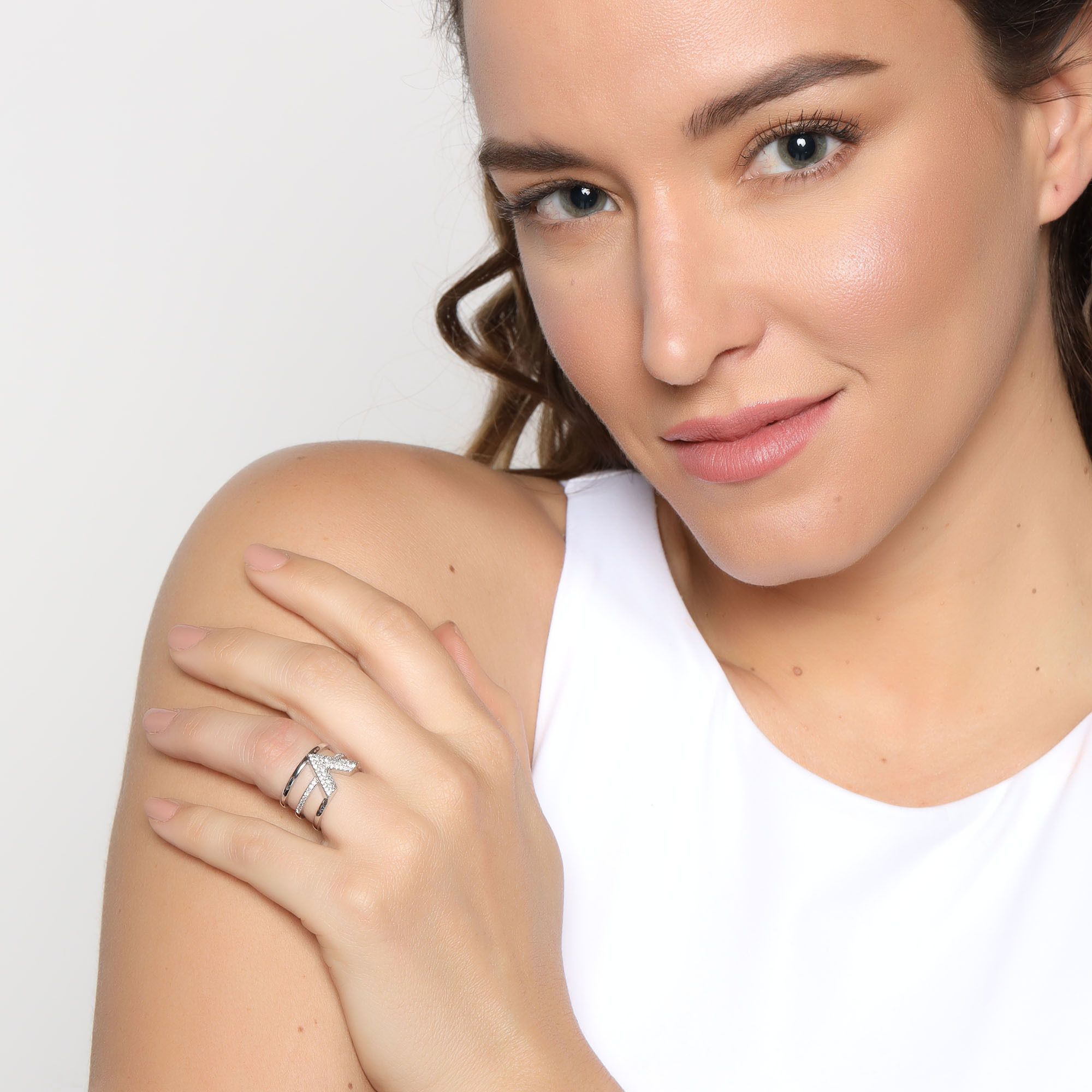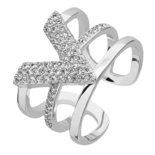 Exclusivo anillo en baño de oro blanco de 18 quilates , diseño de "V", aro estilo triple, con incrustaciones de cristales blancos.