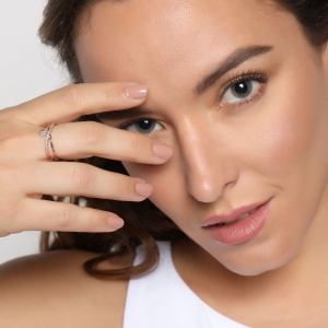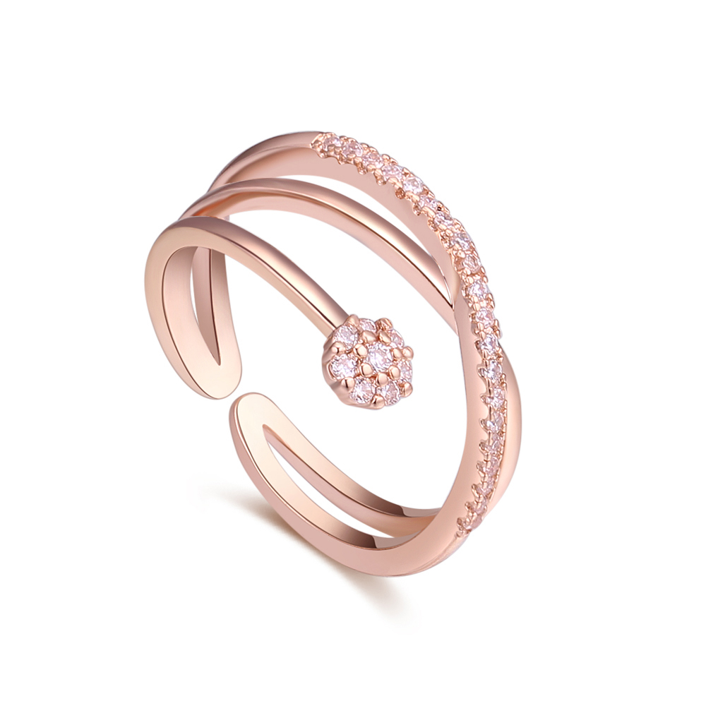 Exclusivo anillo en baño de oro rosa de 18 quilates , diseño entrelazado, con incrustaciones de cristales blancos.
