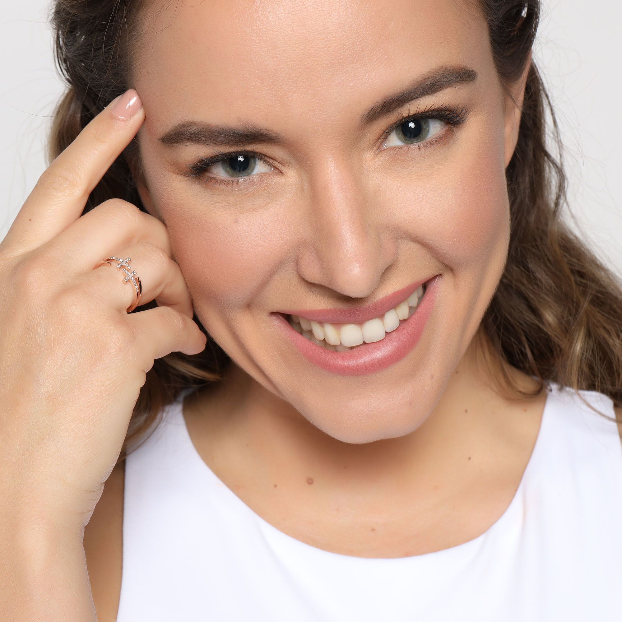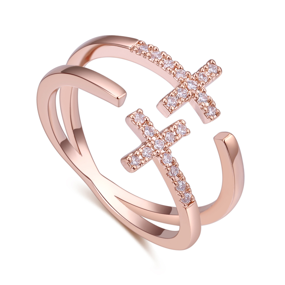 Bonito anillo en baño de oro rosa de 18 quilates , diseño de cruces, con incrustaciones de cristales blancos.