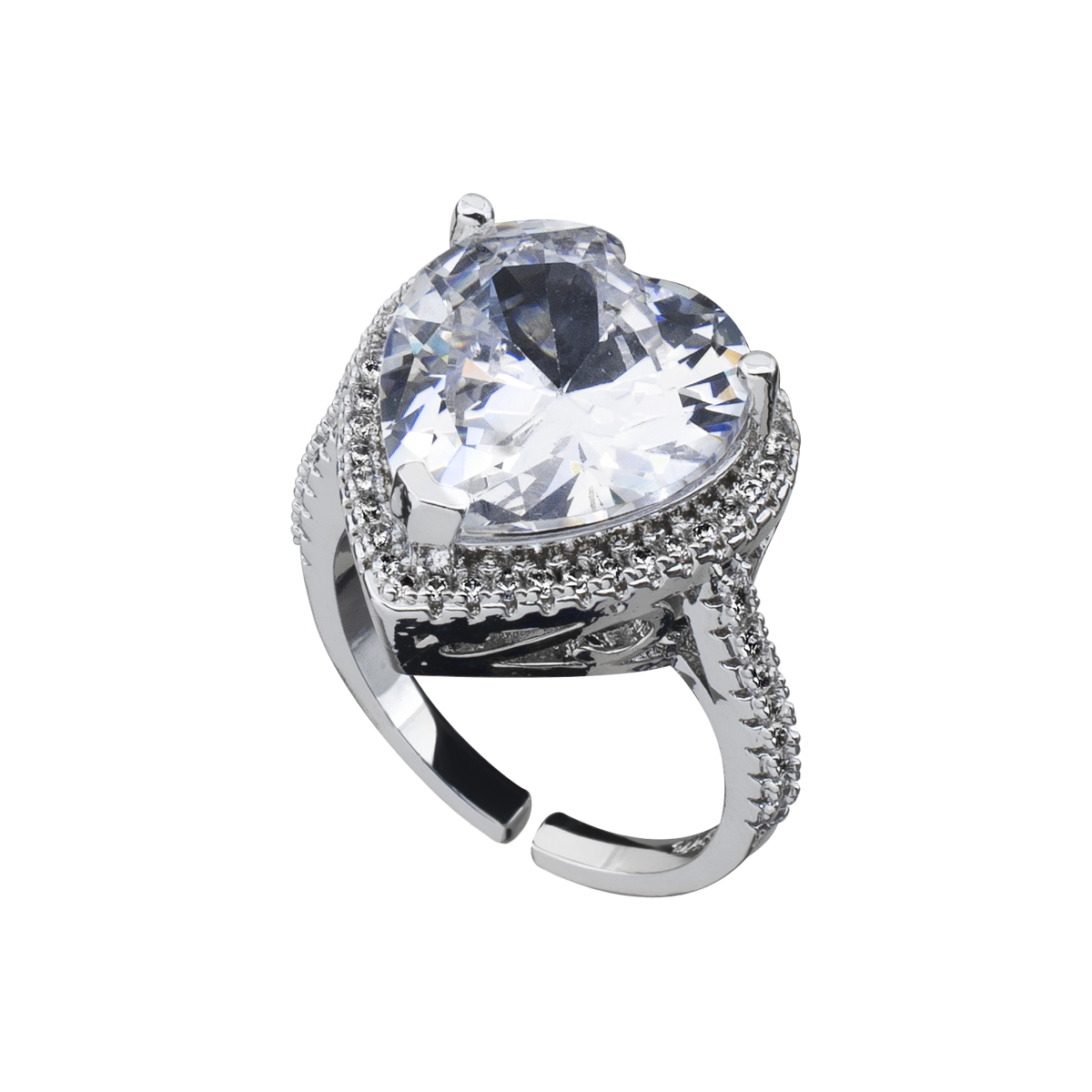 Precioso anillo ajustable en baño de oro blanco de 18 quilates, diseño de corazón con cristal al centro e incrustaciones de cristales en color blanco.