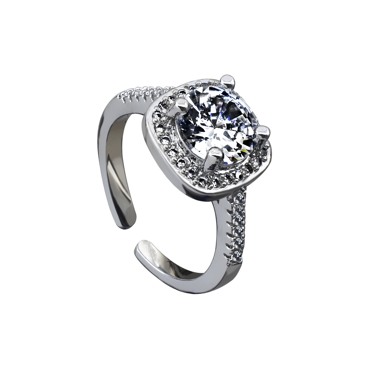 Exquisito anillo ajustable en baño de oro blanco de 18 quilates, diseño cuadrado con incrustaciones de cristales en color blanco.