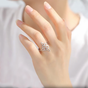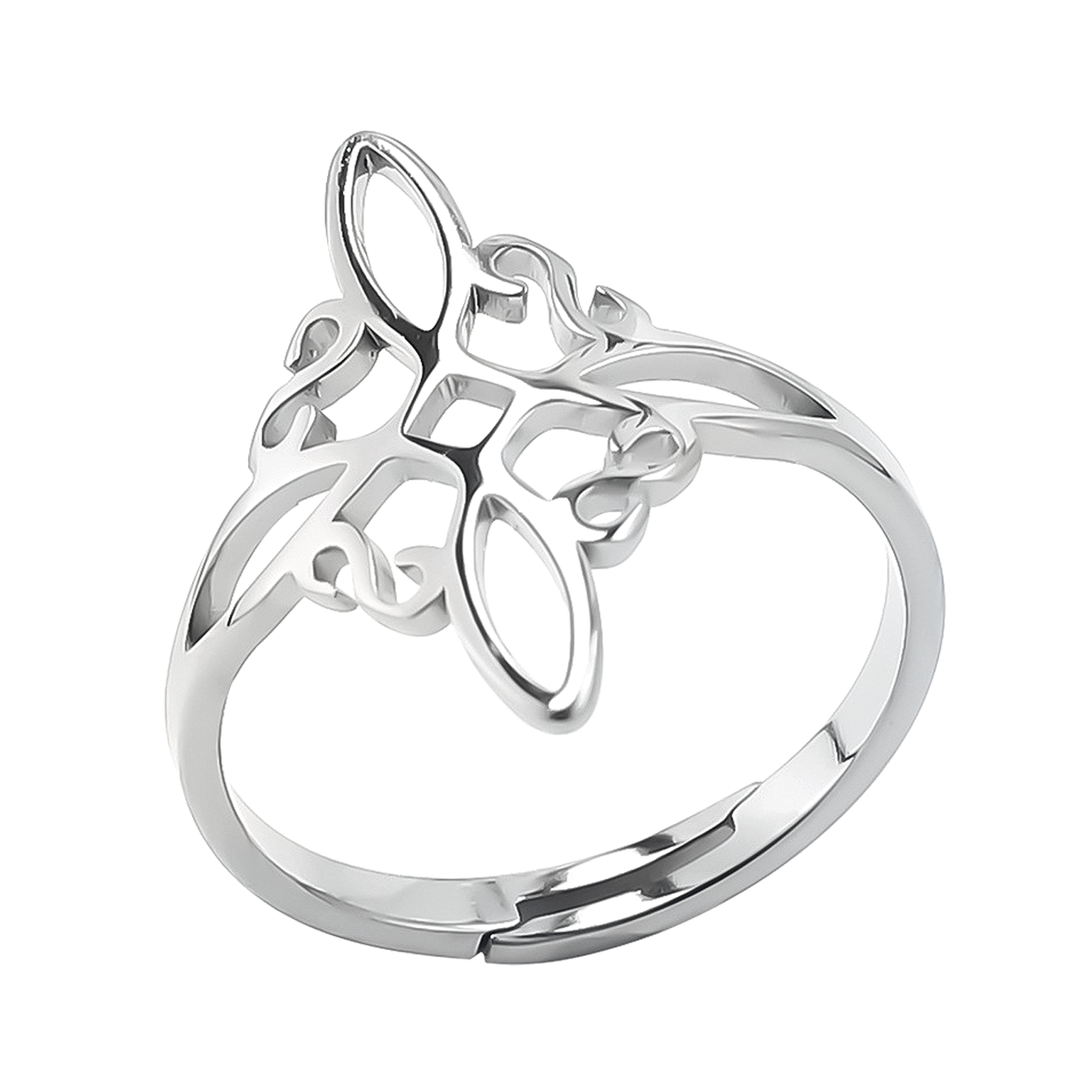 Lindo anillo de acero inoxidable en tono blanco, diseño de nudo de bruja. Ajustable Tallas 6-7.