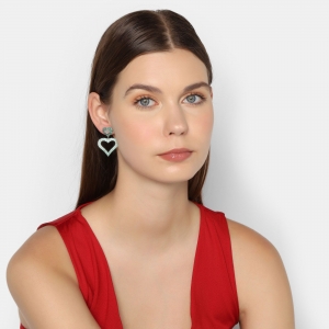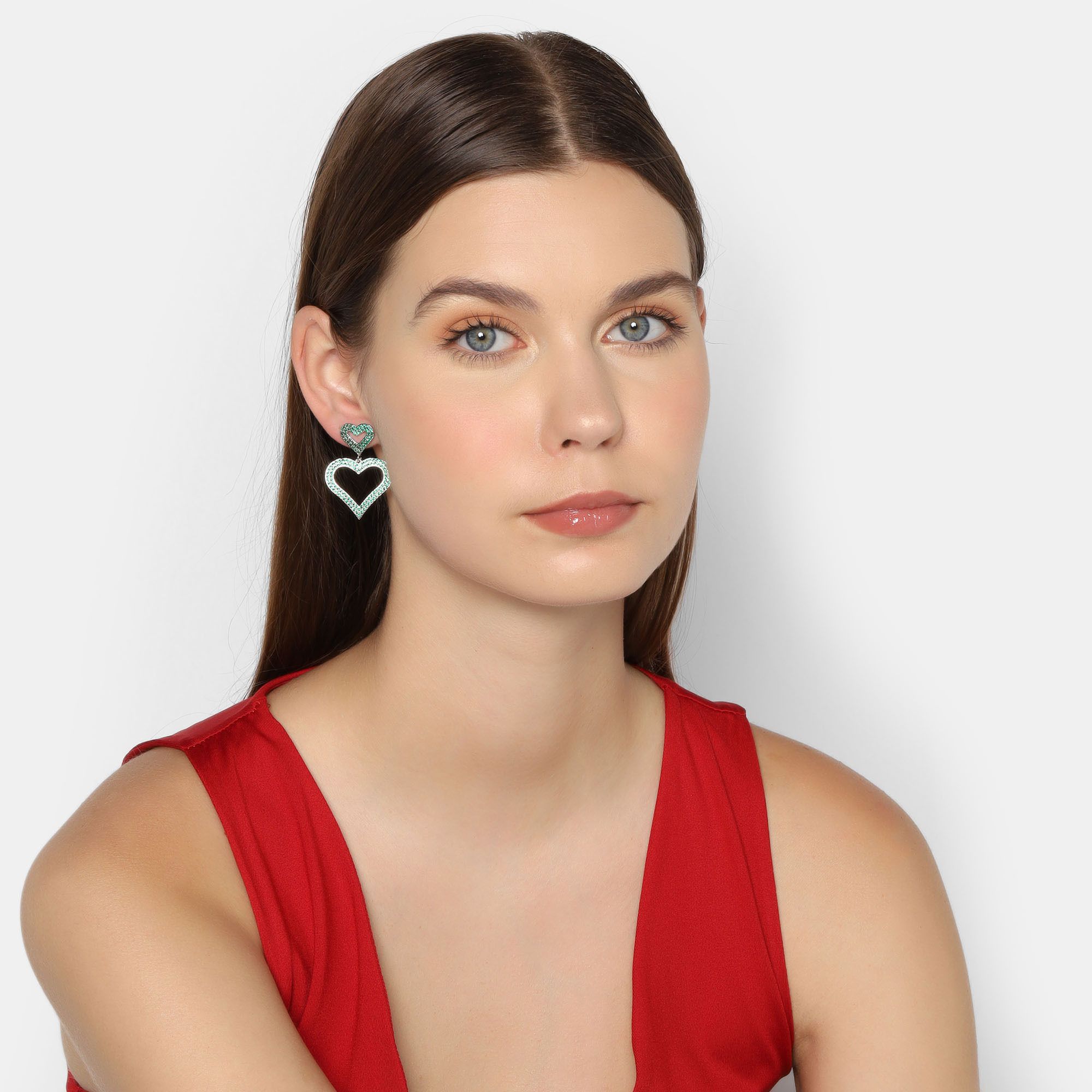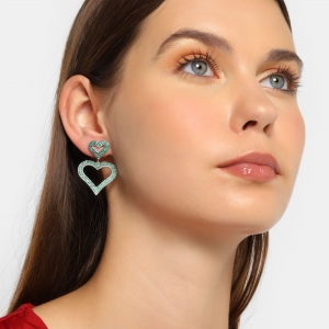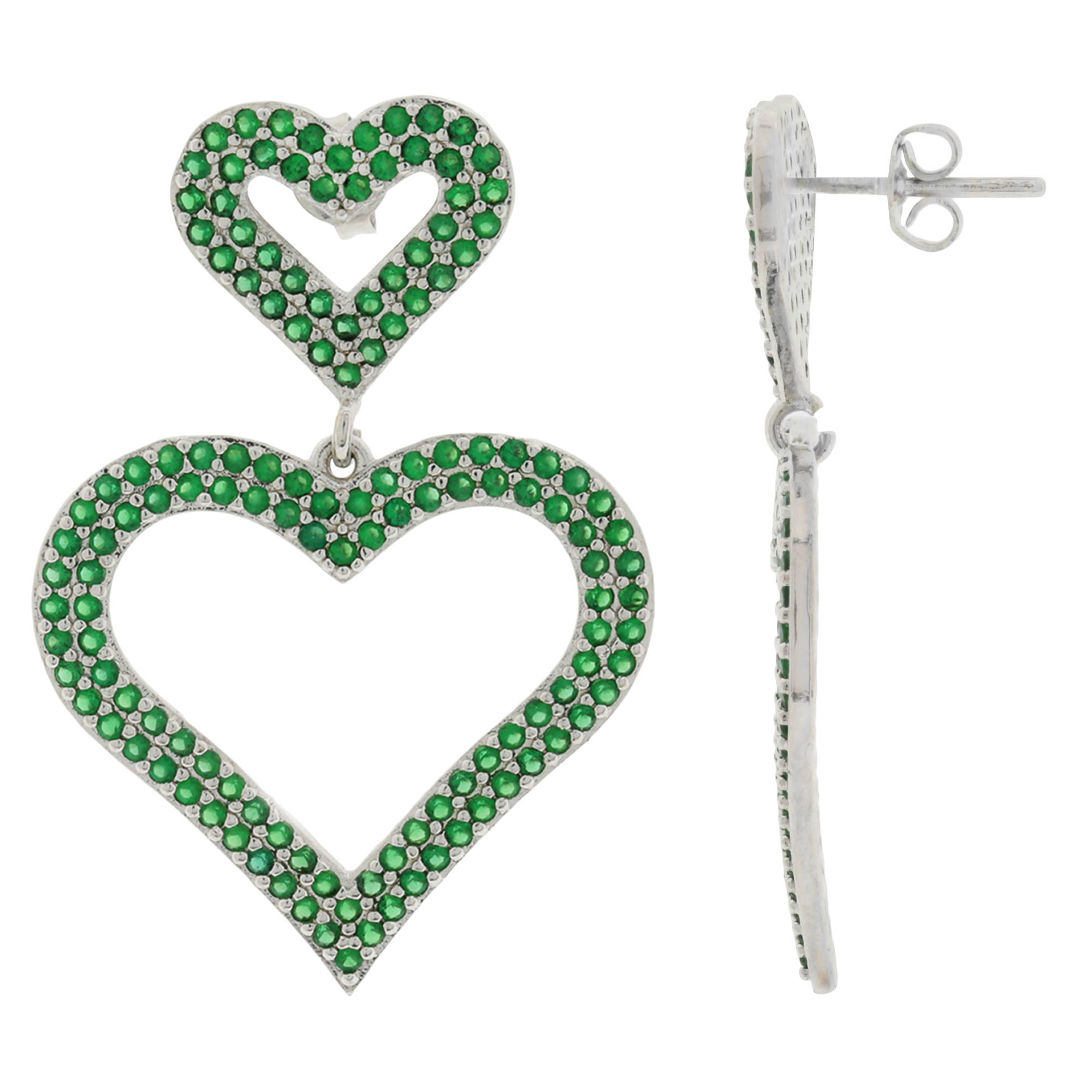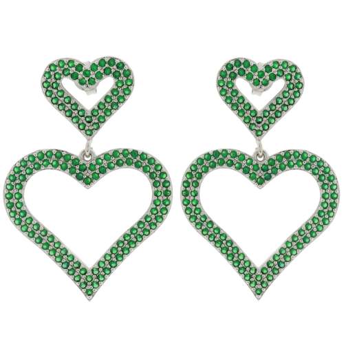 Delicados aretes en acero de titanio en baño amarillo, diseño de corazón doble con incrustaciones de cristales en color verde