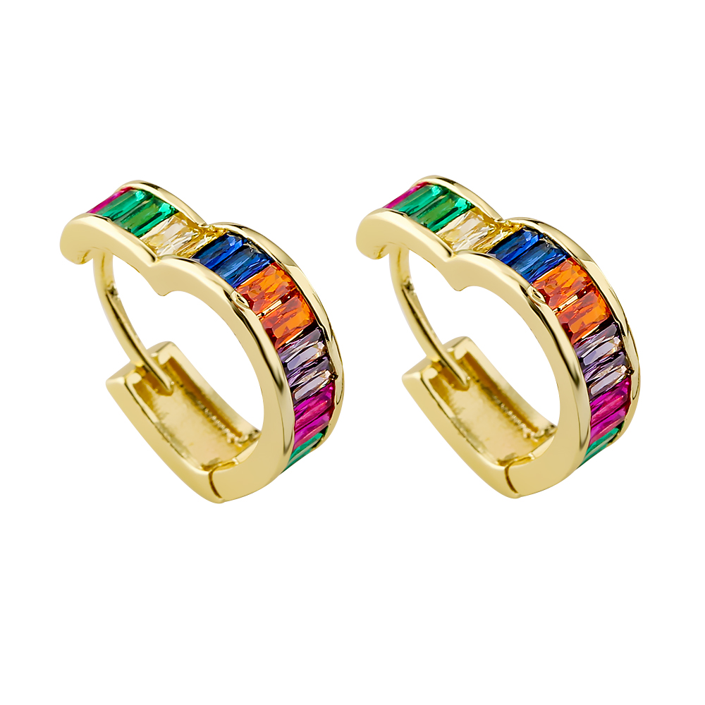Hermosas arracadas en baño de oro amarillo de 18 quilates, fino diseño con incrustaciones de cristales multicolor.