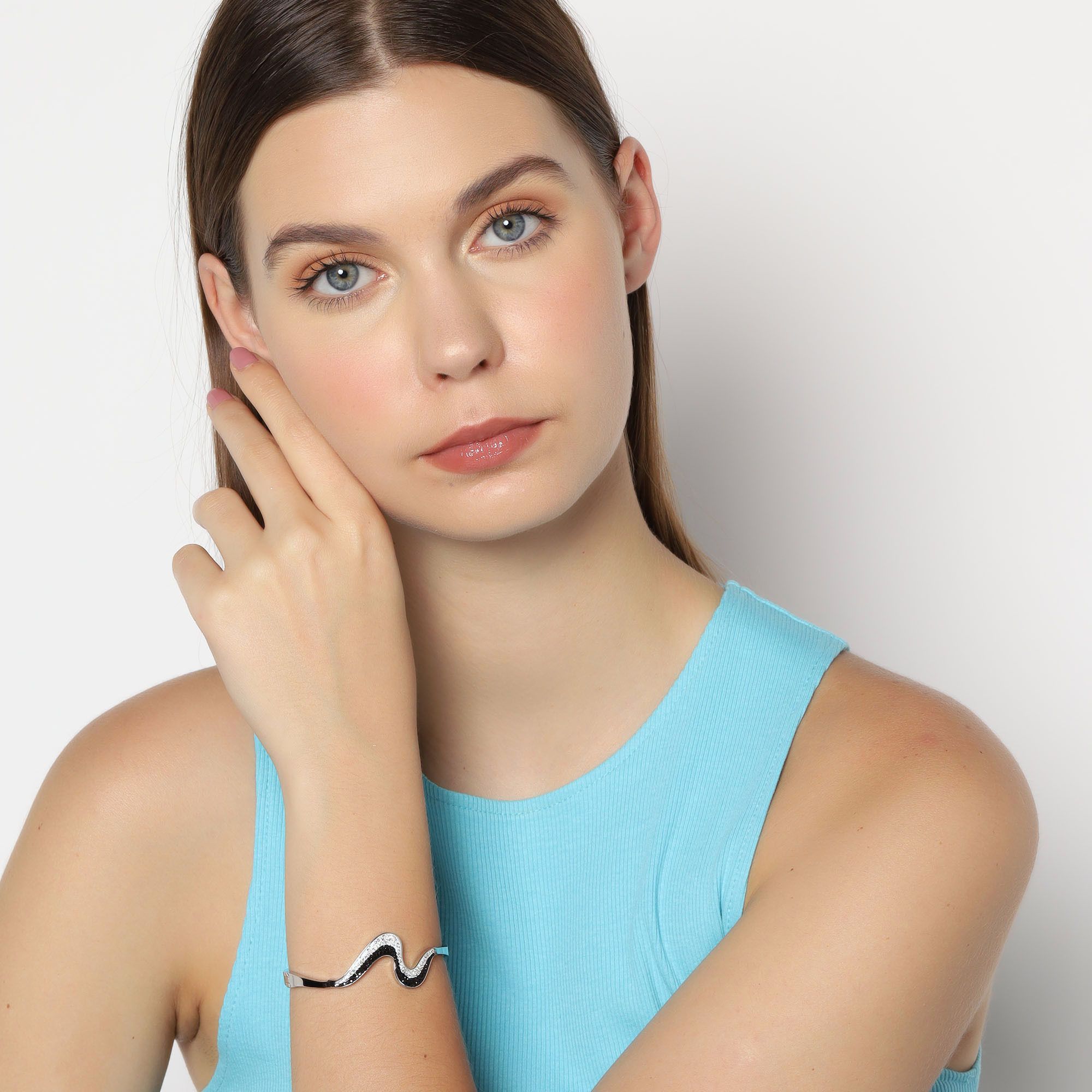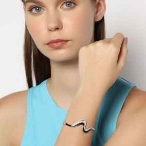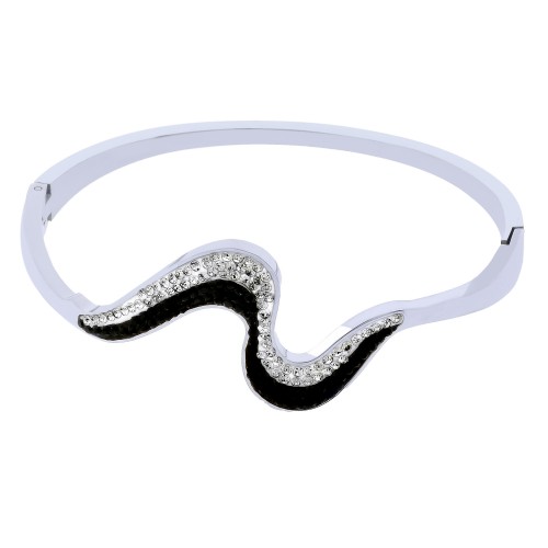 Brazalete en acero inoxidable color blanco, diseño de onda con cristales en color negro y blanco.