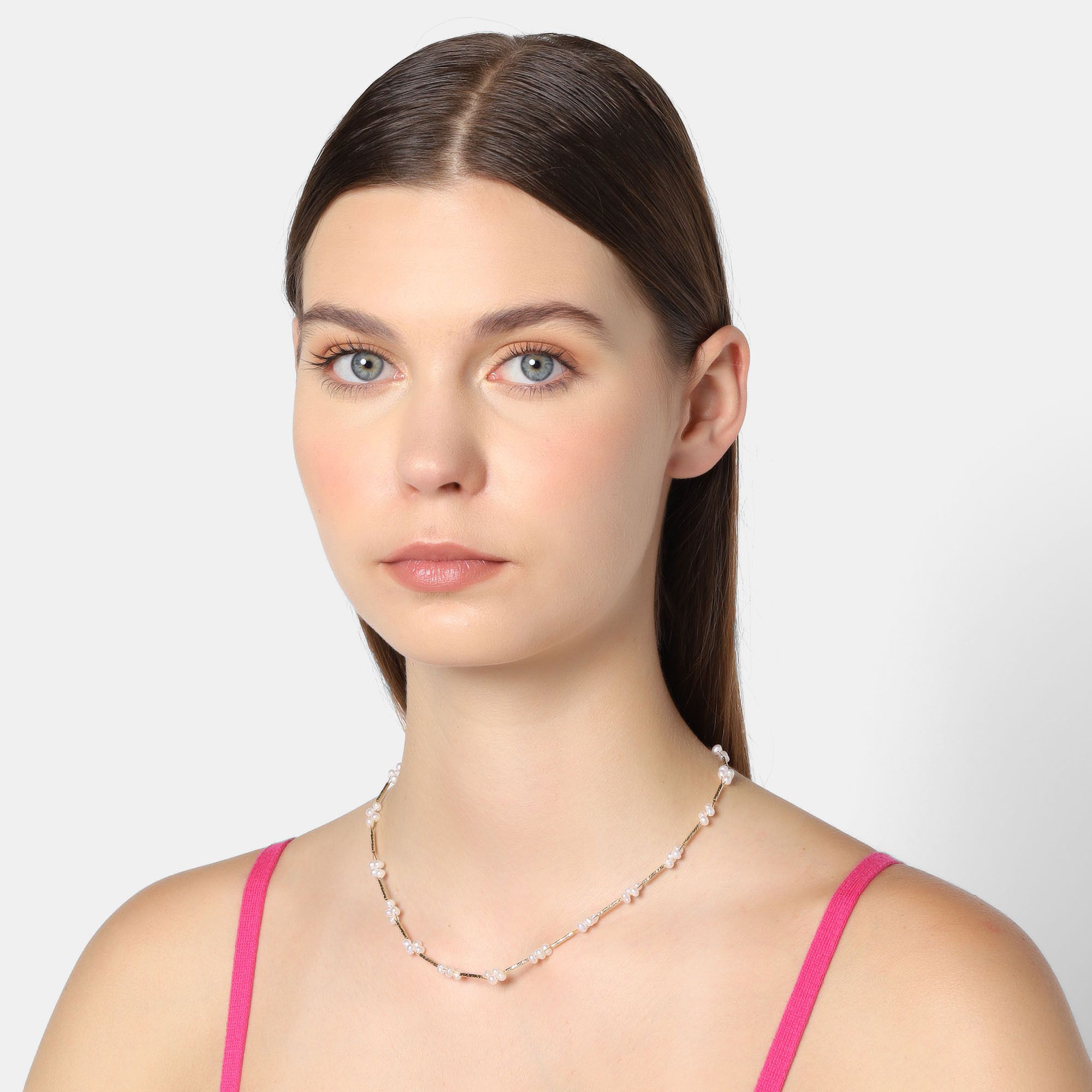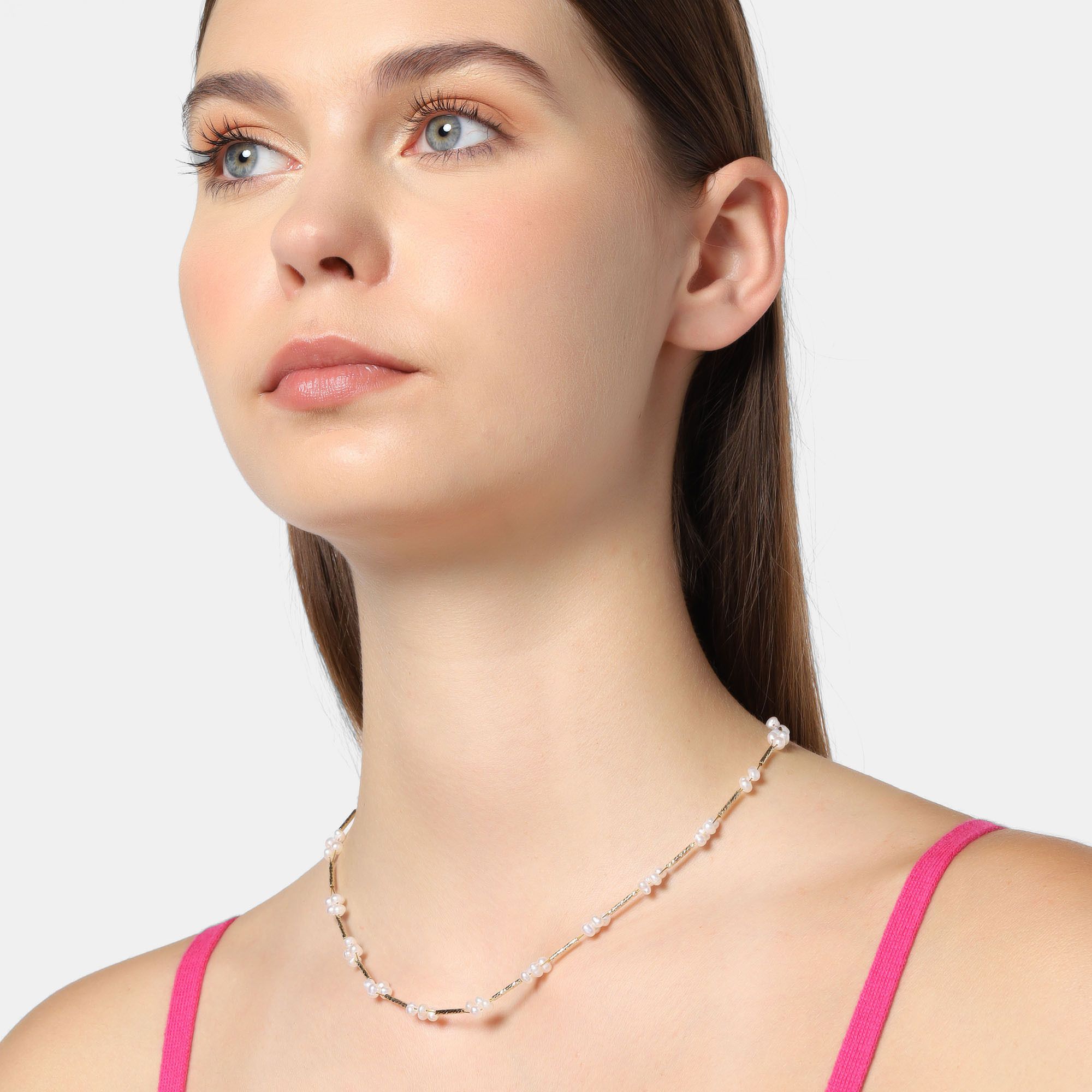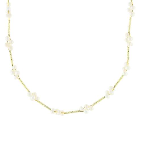 Delicado collar en acero de titanio color amarillo, diseño de flores formadas con pequeñas perlas blancas.