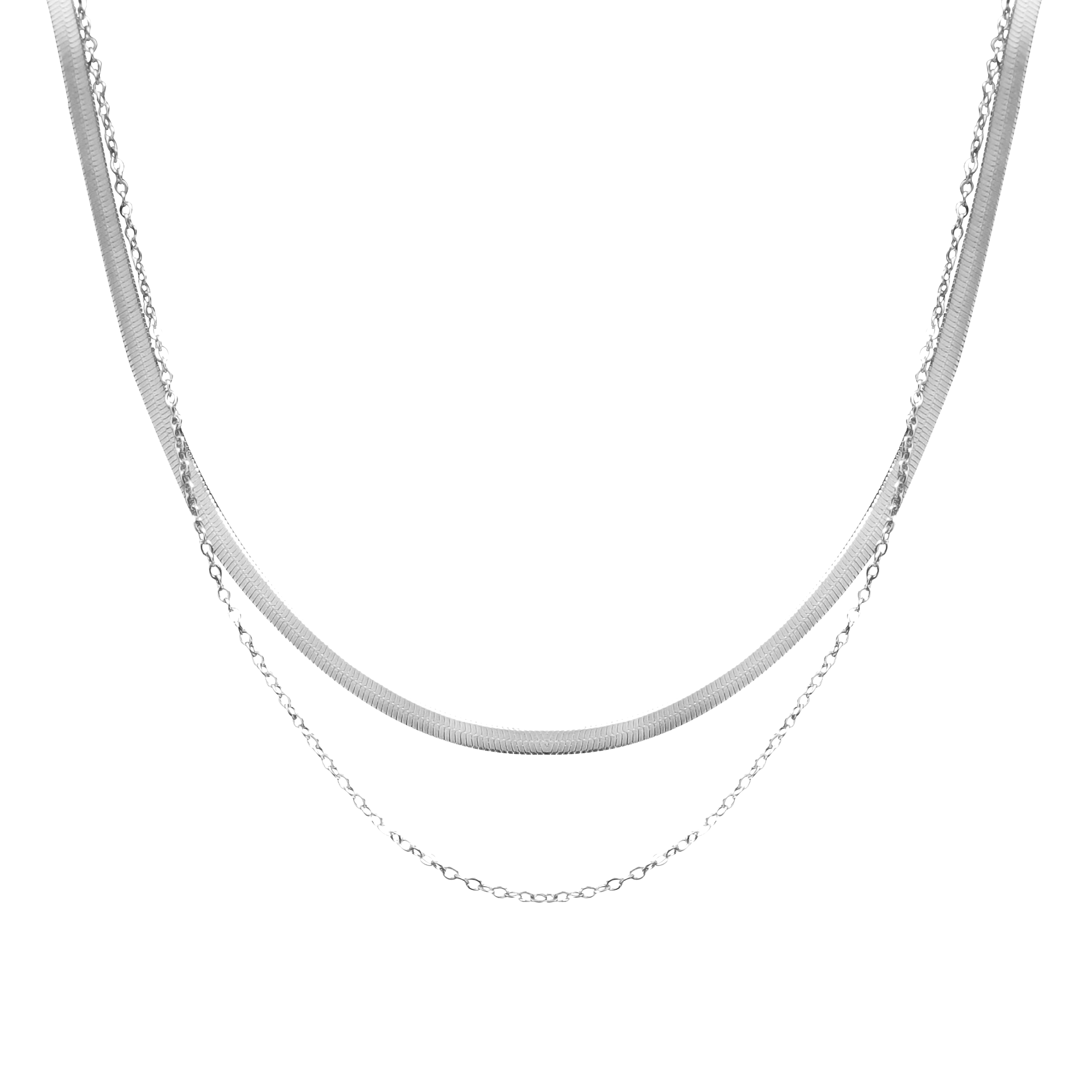 Collar doble de acero inoxidable en tono blanco, cadena planchada y cadena de eslabones.