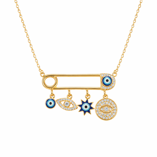 Precioso collar en baño de oro amarillo de 18 quilates, diseño de estrellas y ojos turcos con incrustaciones de cristales en color blanco.