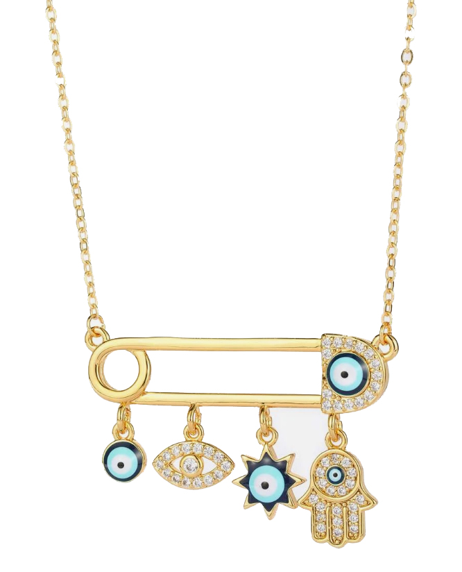 Precioso collar en baño de oro amarillo de 18 quilates, diseño de estrellas y ojos turcos con incrustaciones de cristales en color blanco.