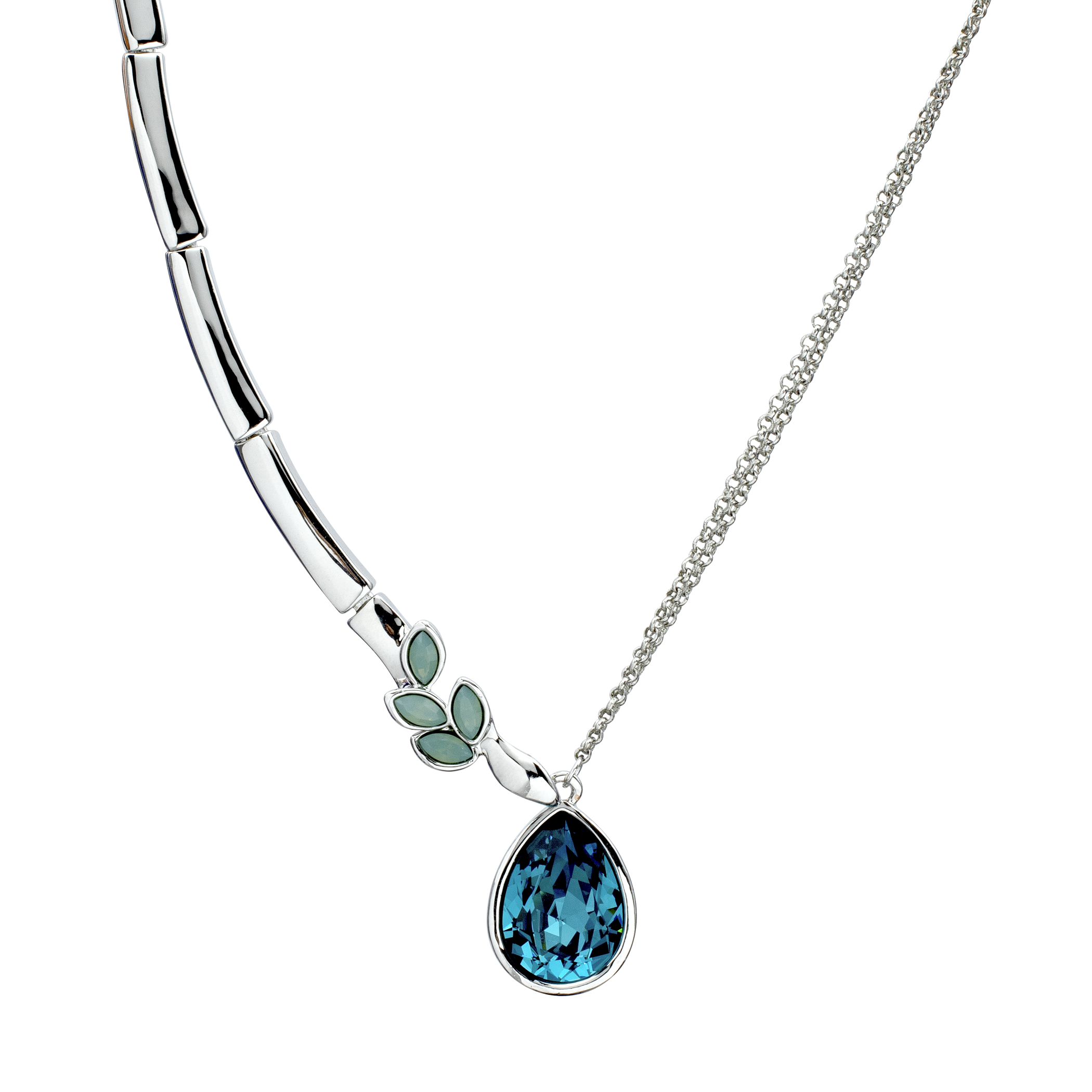 Collar en baño de oro blanco de 18 quilates, fino diseño de gota con incrustación de cristales en color azul turquesa . Fabricado en una estructura de aleación de platino con rodio sin níquel