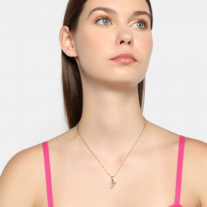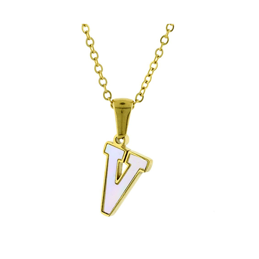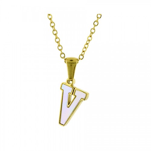 Dije con cadena en acero de titanio color amarillo, diseño de letra "V", con placa de madre perla.