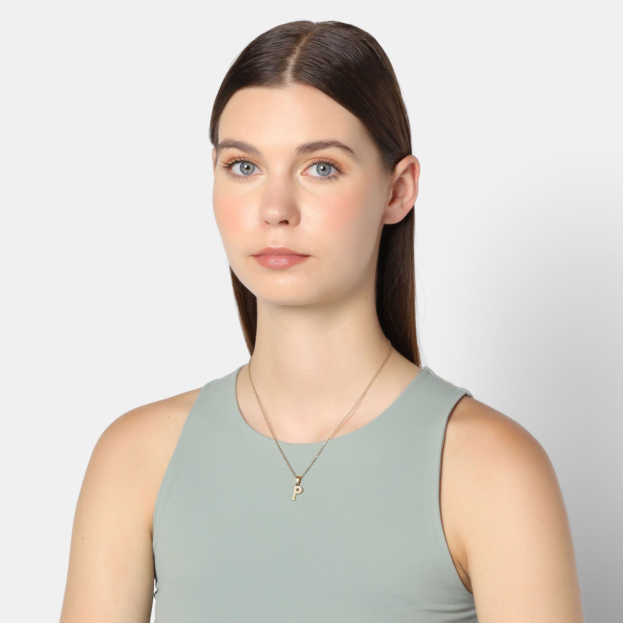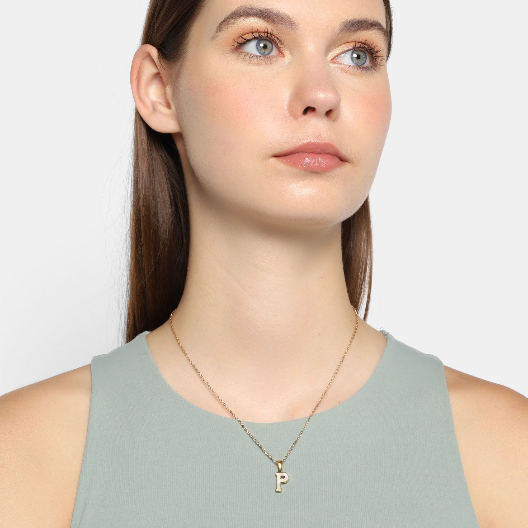 Dije con cadena en acero de titanio color amarillo, diseño de letra "P", con placa de madre perla.
