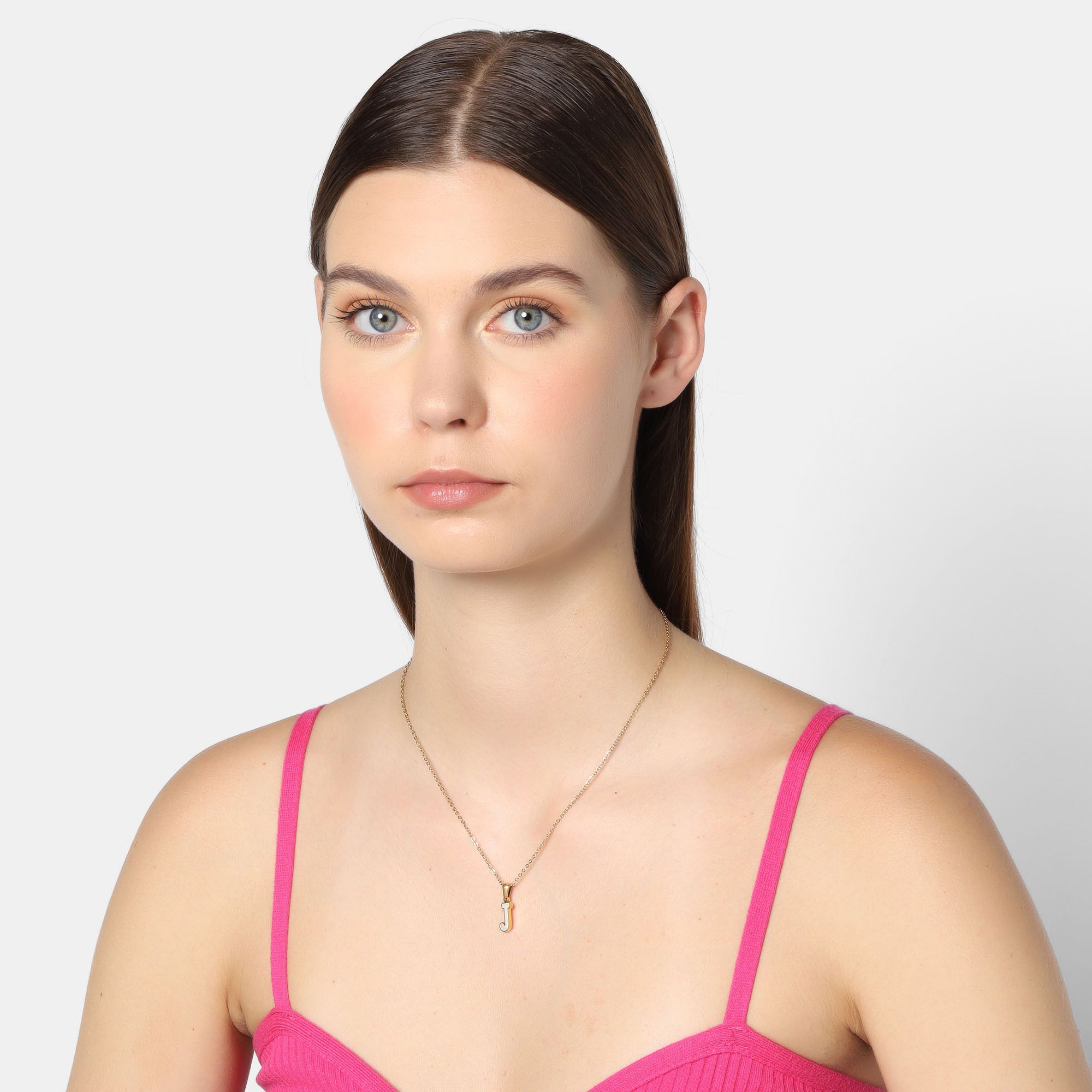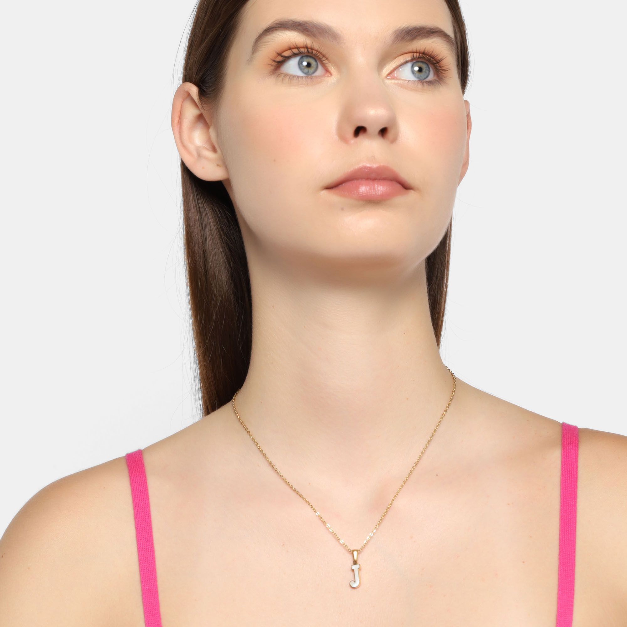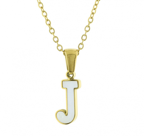 Dije con cadena en acero de titanio color amarillo, diseño de letra "J", con placa de madre perla.