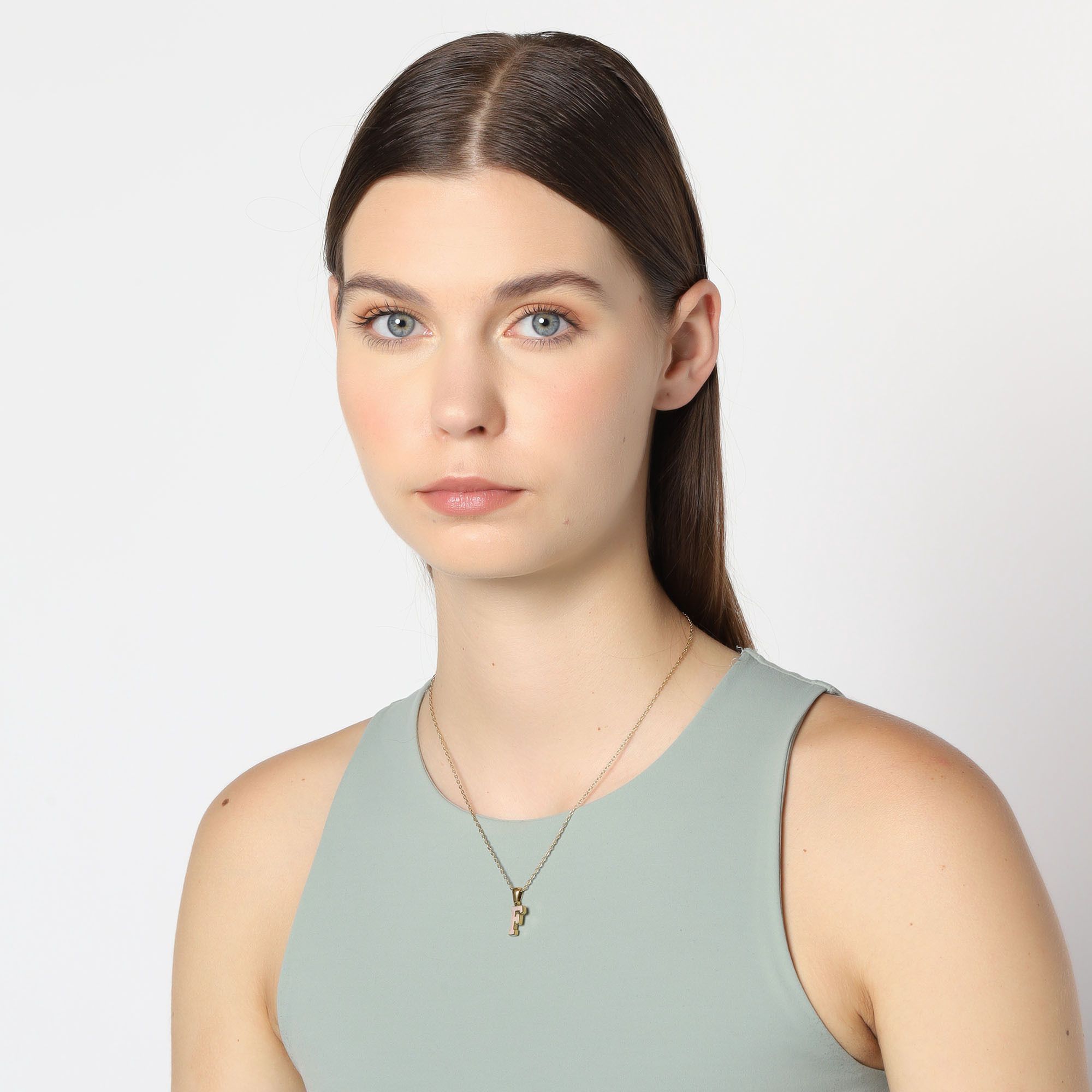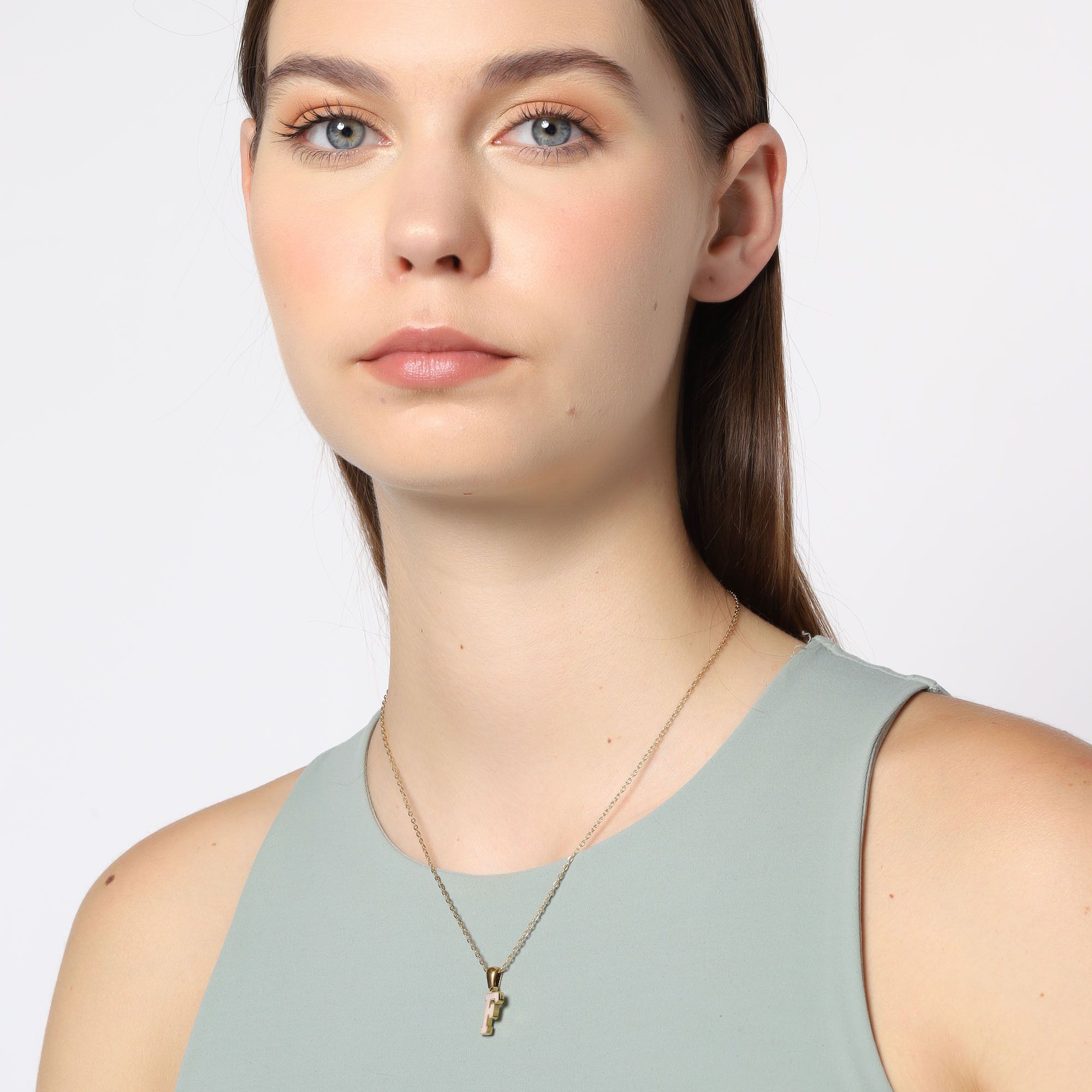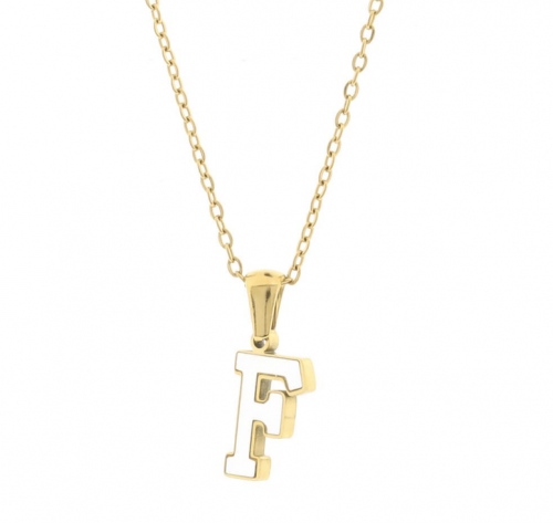 Dije con cadena en acero de titanio color amarillo, diseño de letra "F", con placa de madre perla.