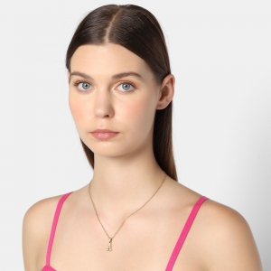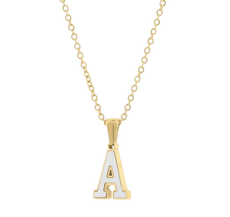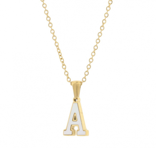 Dije con cadena en acero de titanio color amarillo, diseño de letra "A", con placa de madre perla.