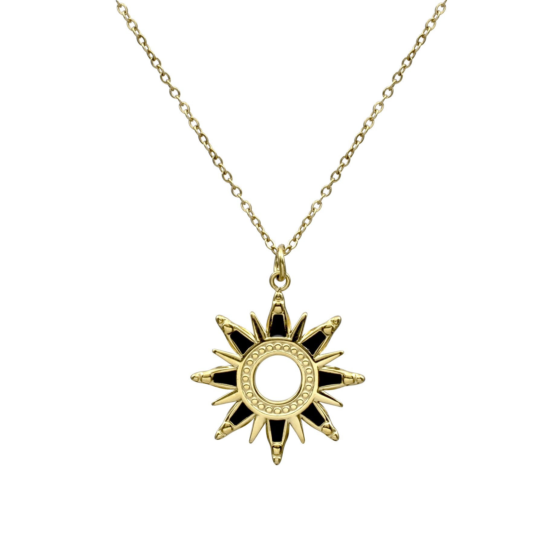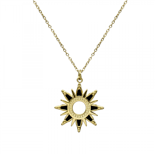 Lindo collar para sweater en baño de oro amarillo de 18 quilates, diseño sol con esmaltado negro.