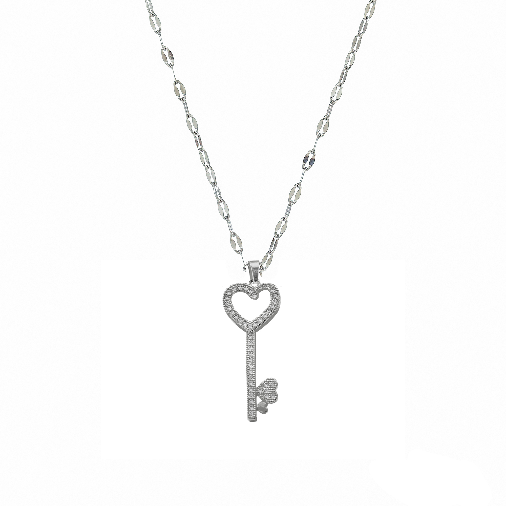 Hermoso dije en baño de oro blanco de 18 quilates, diseño de llave en forma de corazón con incrustaciones de cristales en color blanco.