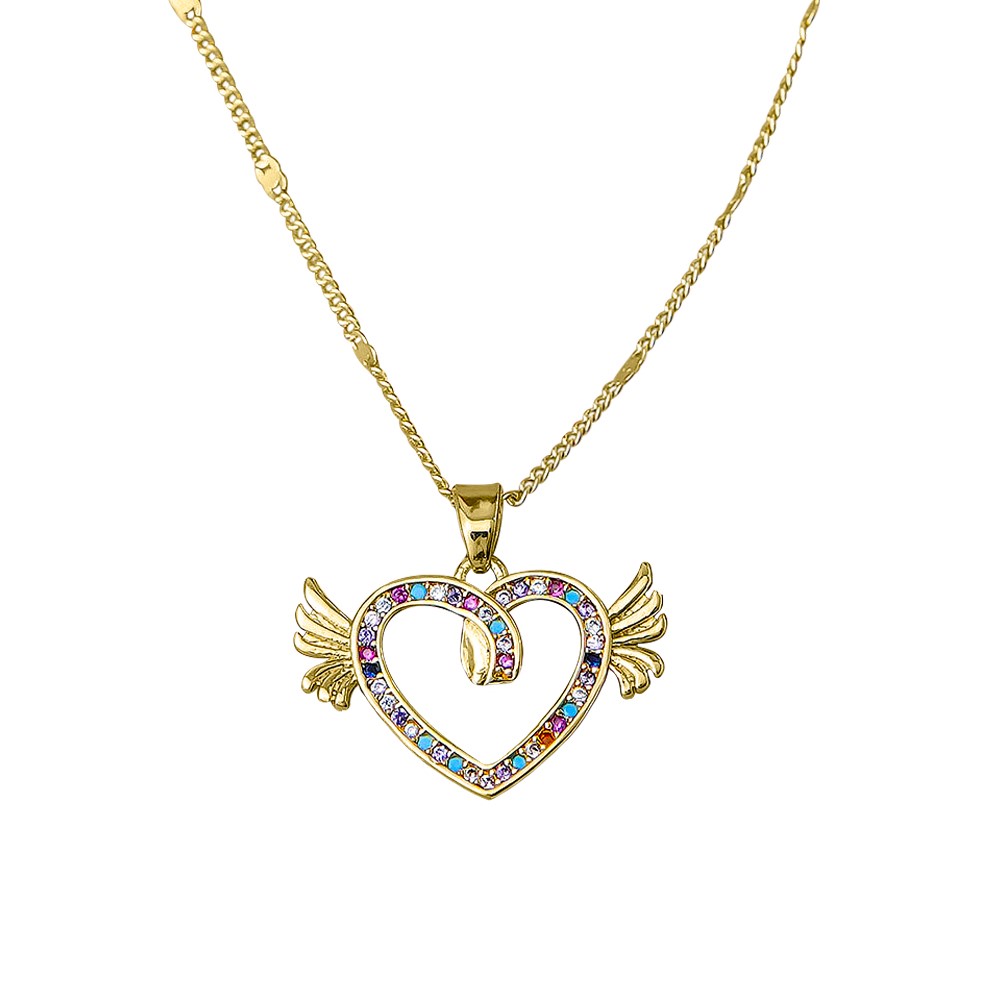Dije con cadena en baño de oro amarillo de 18 quilates, diseño de corazón con alas.