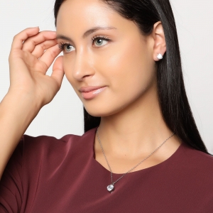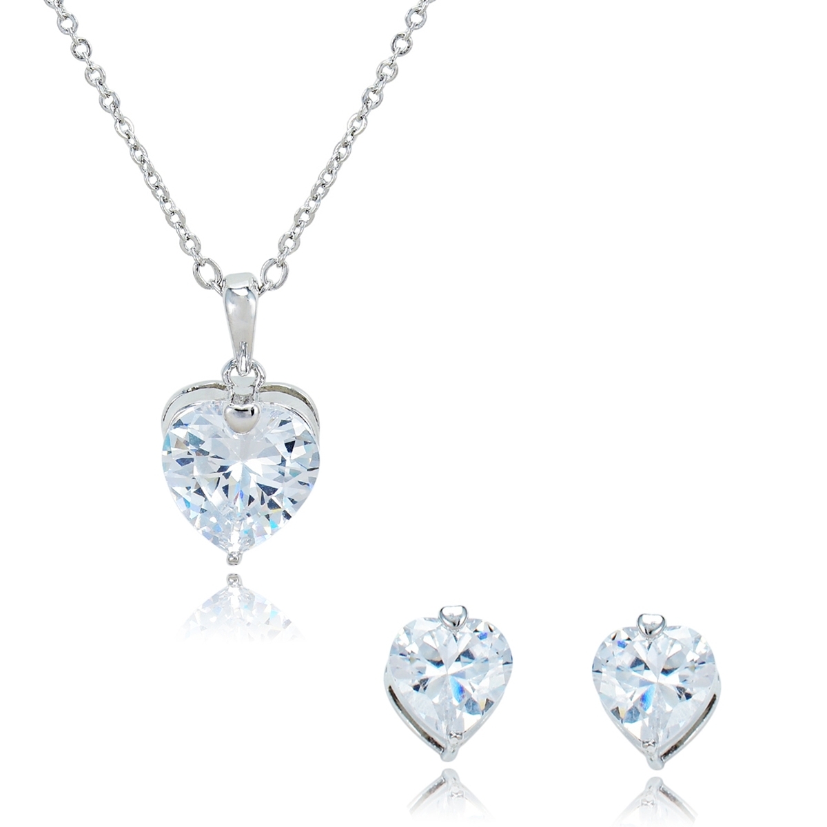 Tierno conjunto de dije con cadena y aretes en baño de oro blanco de 18 quilates, diseño de corazones, con cristales blancos corte corazón.