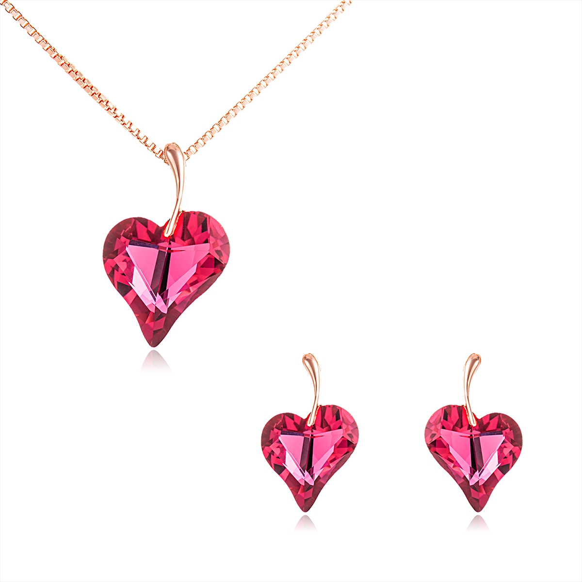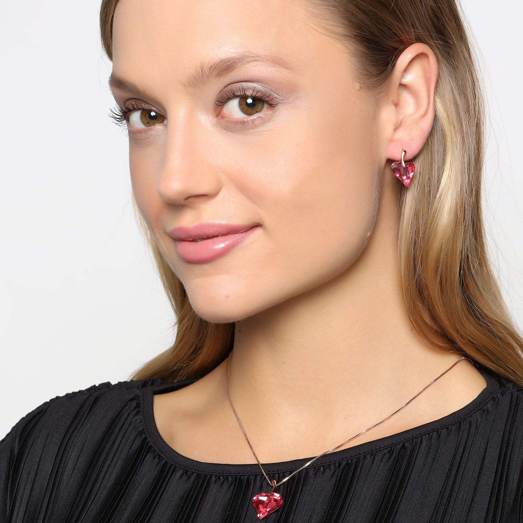 Fino conjunto de dije con cadena y aretes en baño de oro rosa de 18 quilates, diseño de corazones en cristal rosa.