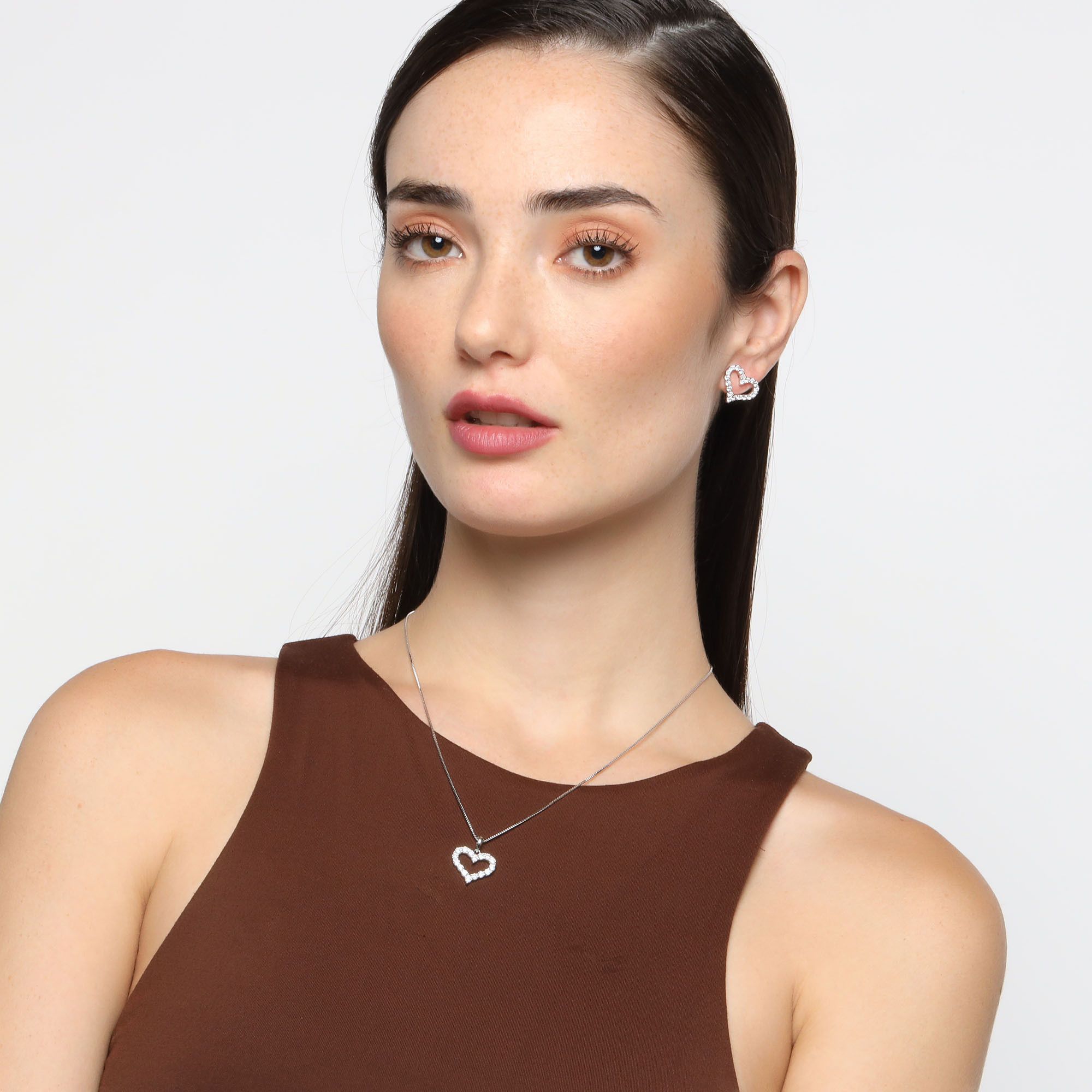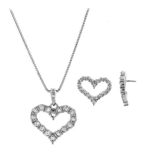 Exquisito conjunto de dije con cadena y aretes en baño de oro blanco de 18 quilates, diseño de corazones con incrustaciones de cristales blancos.