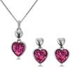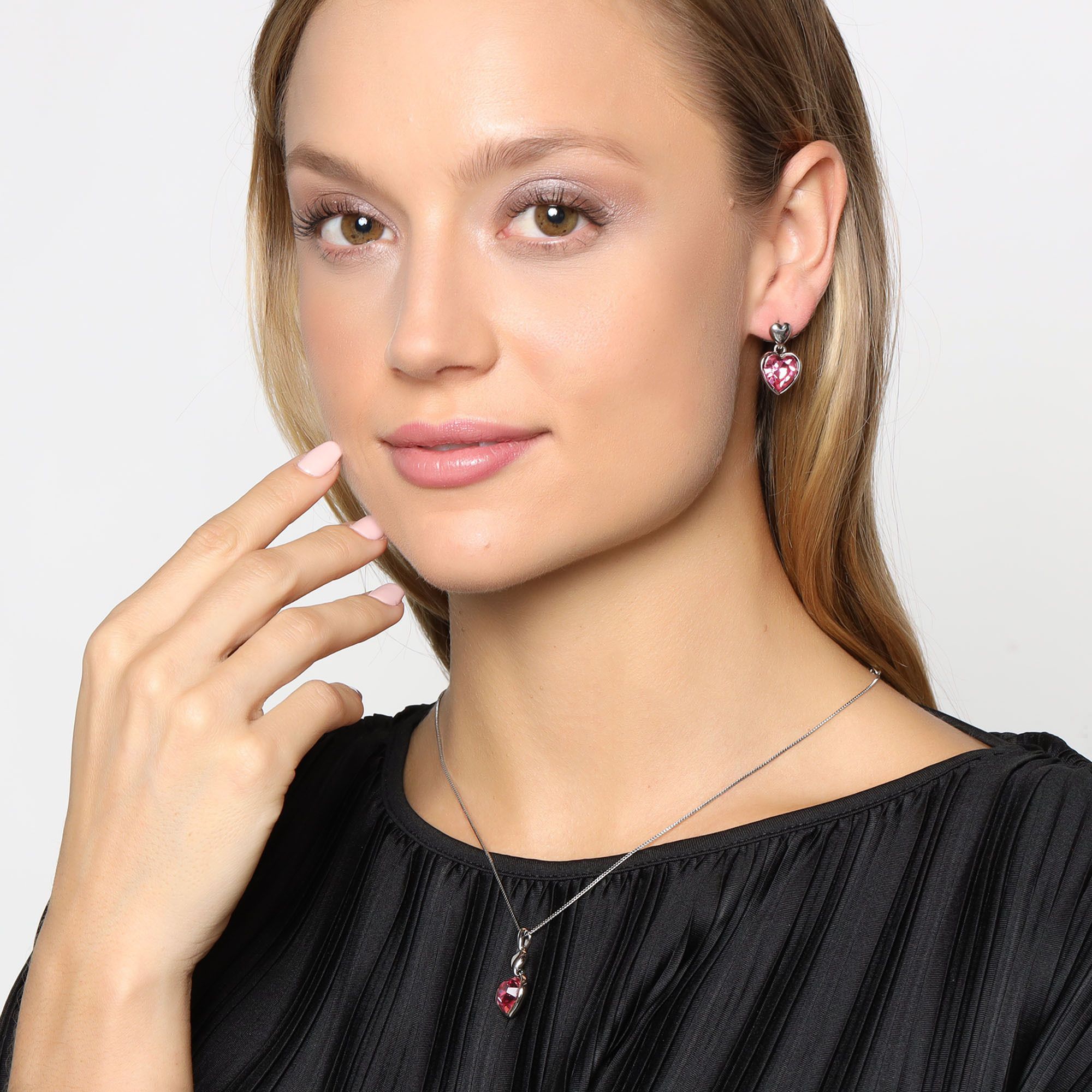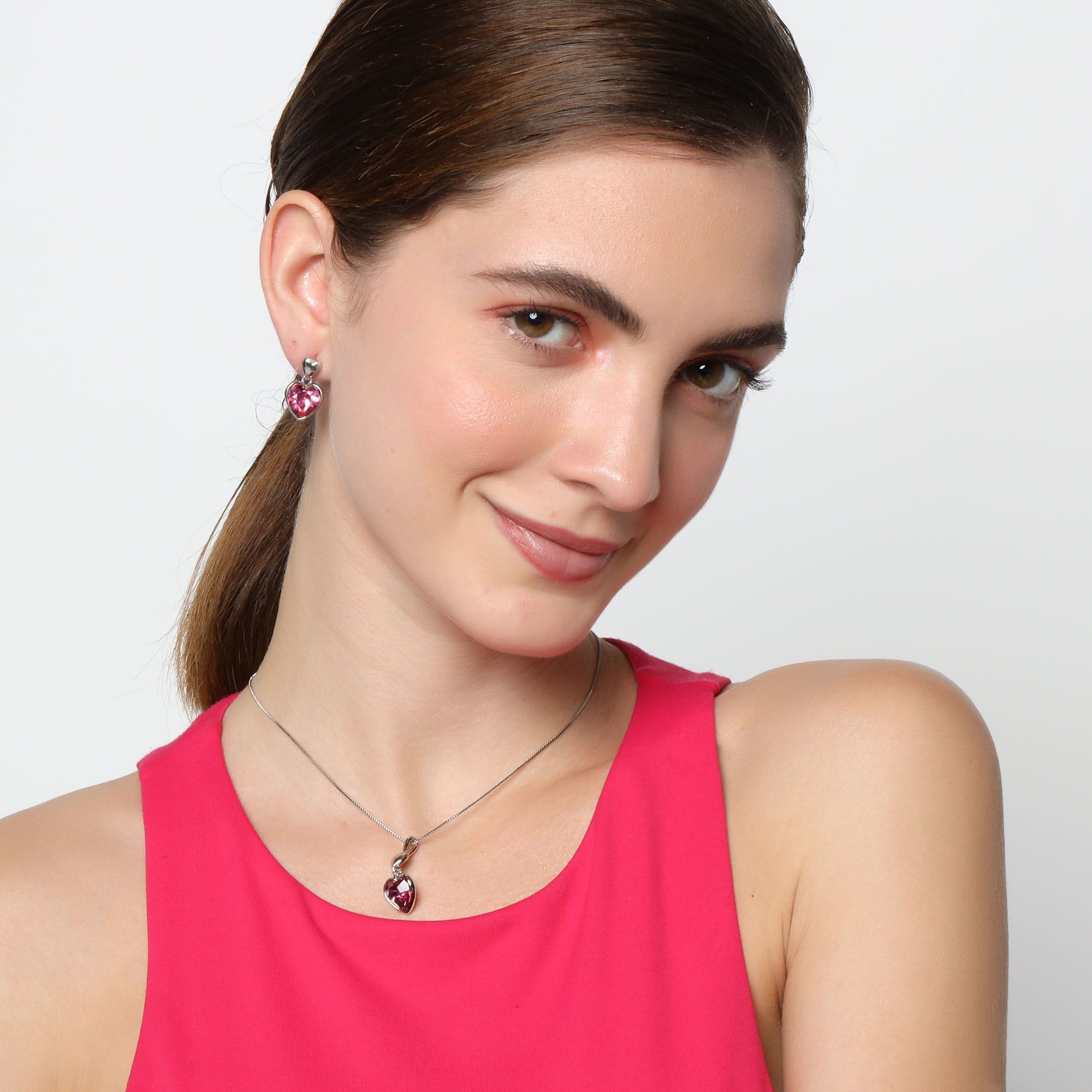 Tierno conjunto de dije con cadena y aretes en baño de oro blanco de 18 quilates, diseño de corazones en cristal rosa.